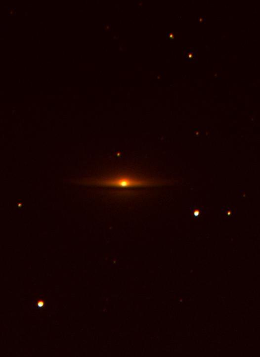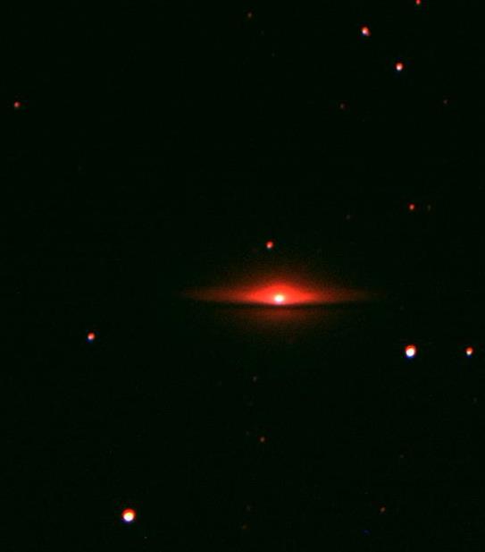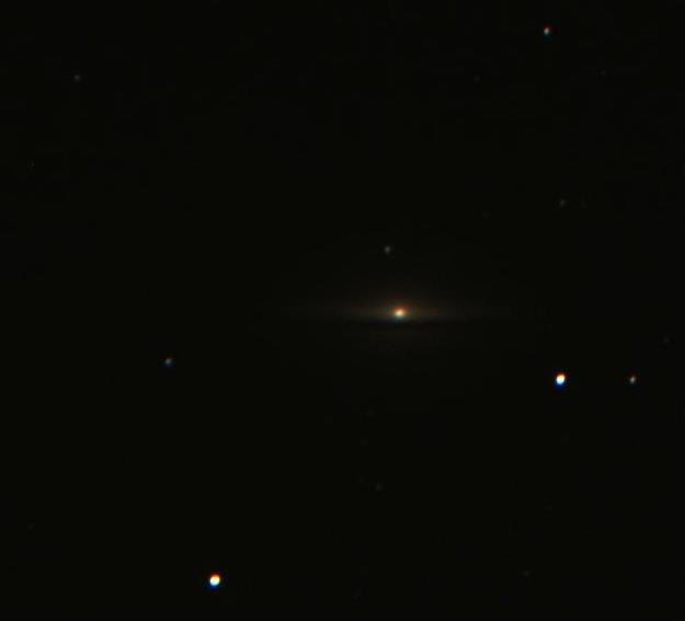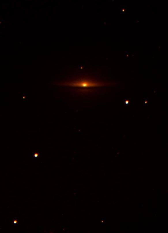 Today’s photos are of the Sombrero Galaxy (M104/NGC5494). It is an unbarred spiral galaxy found in the constellation Virgo. It is 29 to 32,000,000 light years from Earth and from our position is observed nearly edge on. It has three distinct features – a bright nucleus, a large central bulge and a central dust lane or ring which circles the bulge. Together these give the impression of a sombrero. The large central bulge contains at its centre a massive black hole, one of the largest so far detected. The dust ring consists of hydrogen gas and dust and is thought to be the primary site of star formation within the galaxy.