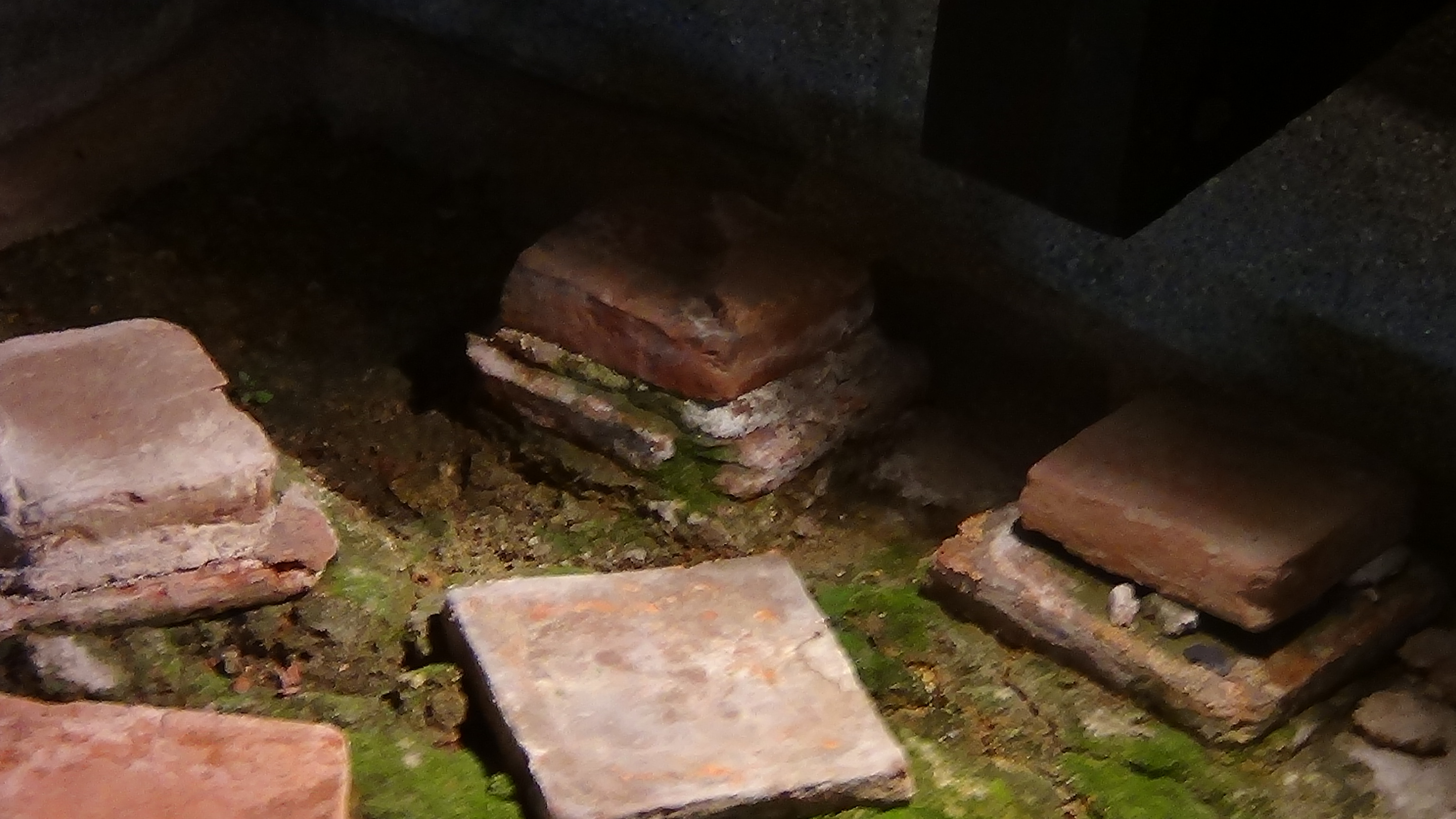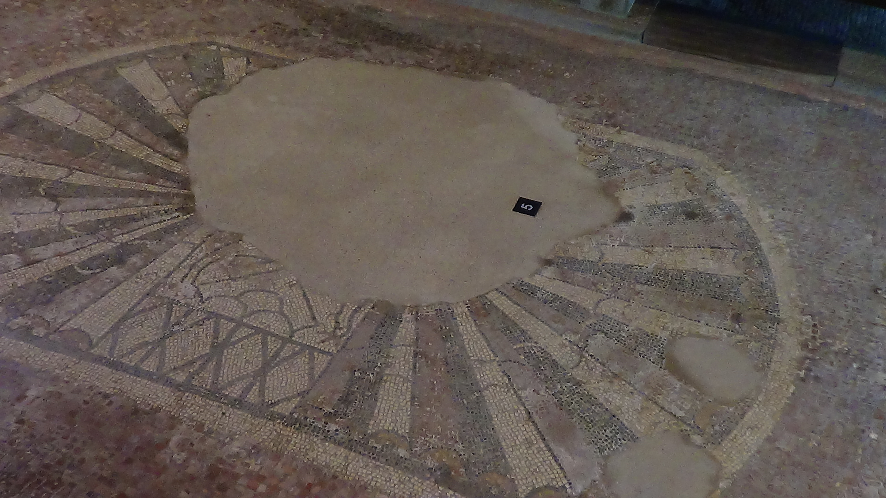 This ‘Knot mosaic’ depicts Solomon’s knot surrounded by braided coloured strands. This was in a room which had an underfloor heating system.