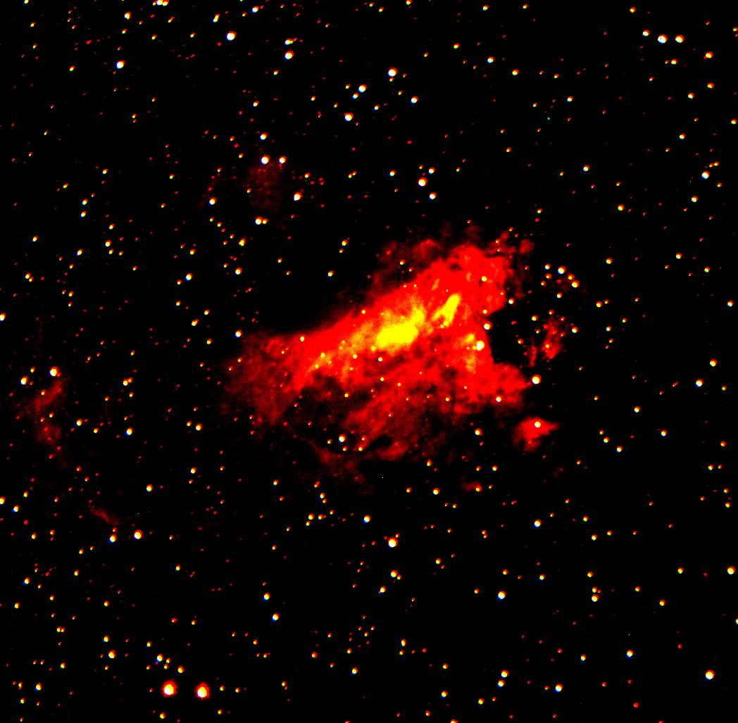 The Swan Nebula (AKA the Lobster or Horseshoe Nebula) (M17/NGC6618) is a very bright gas cloud containing dust and molecular gases which is reckoned to be one of the largest star forming regions in the galaxy. It is 5-6,000 light years away from Earth and is probably 15-20 light years across. It is located in the northern part of the constellation Sagittarius and is so bright it can be seen with binoculars.