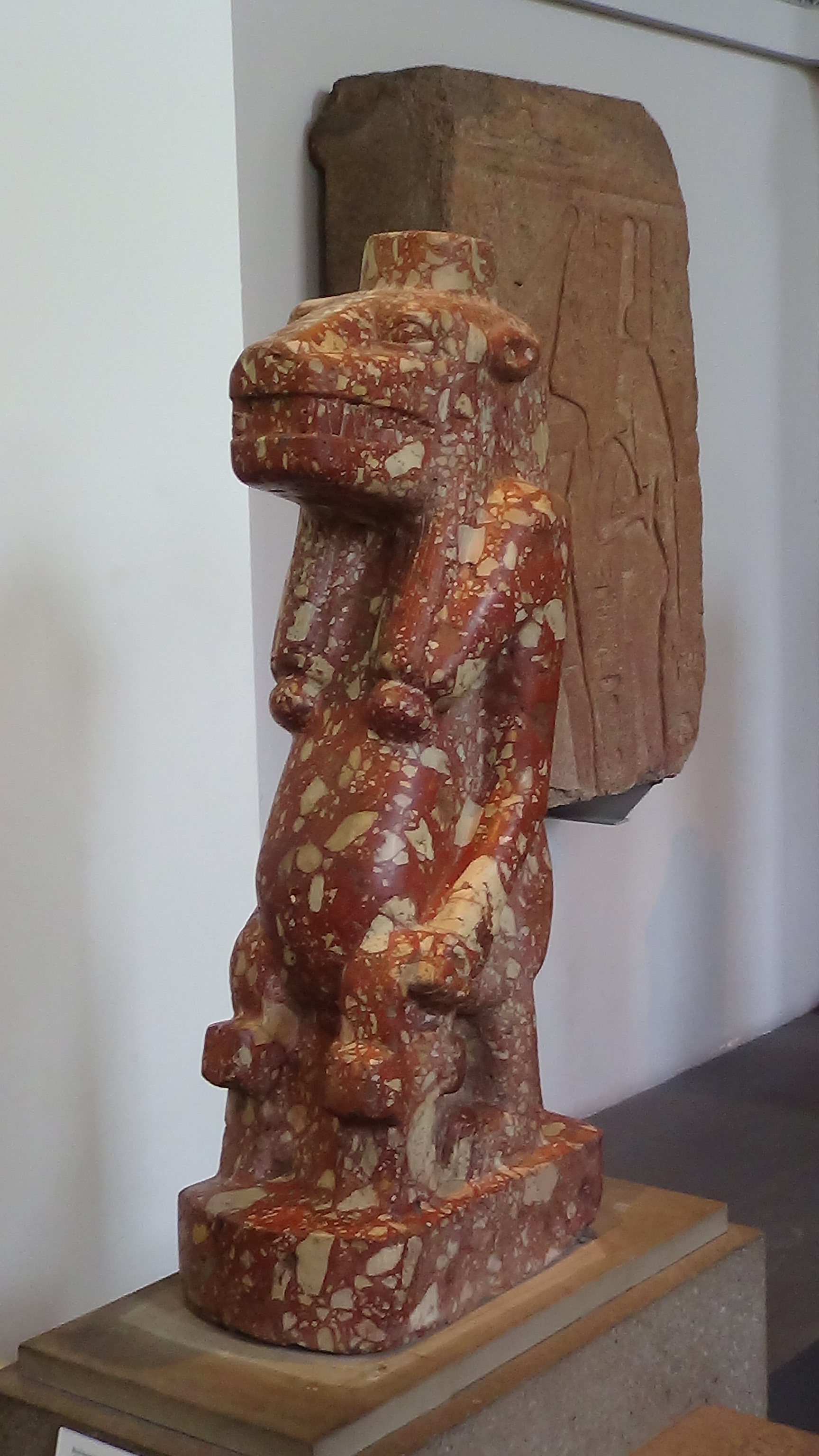 This red breccia figure from the British Museum is of the Egyptian goddess Taweret. She is usually portrayed as a pregnant hippopotamus with the face of a lion. She is sometimes also shown the back of a Nile crocodile. The choice of a hippopotamus for a depiction of a deity may seem strange to us, but female hippos are renounced for their protection of their young and this must have been an image that appealed to the ancient Egyptians. Indeed, the female hippopotamus was a relatively common animal image use for protective deities associated with the birth and care of the young.