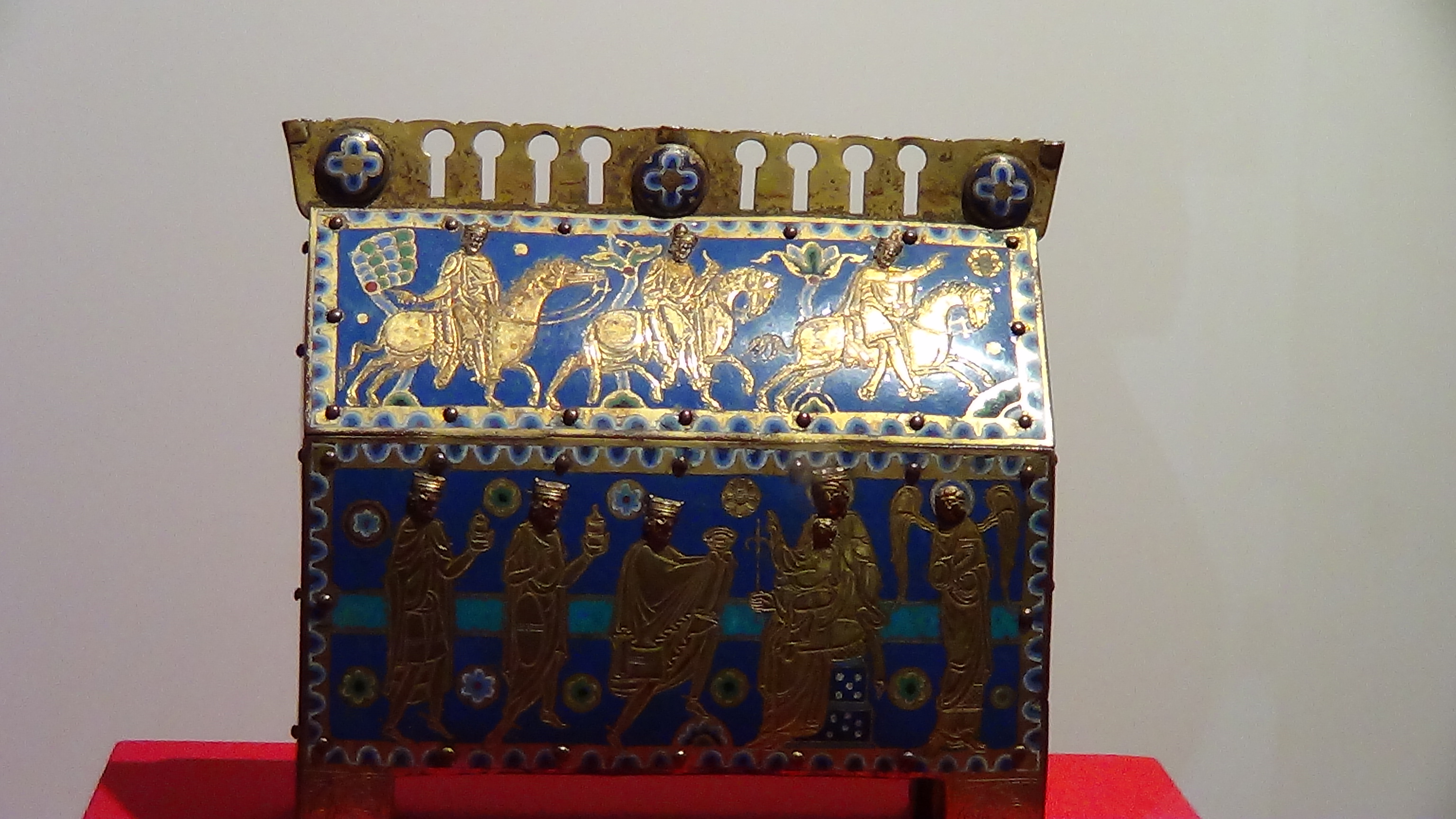 Persian and Zoroastrian imagery has often been used in connection with ‘the three wise men’ or ‘the three Kings’ from the Christian Christmas story. In this 13th century enamelled reliquary casket from France, the wise men are shown wearing Persian tunics and trousers. In the image of the presentation the hand of the first King is covered as a sign of piety and respect in the Persian and Zoroastrian tradition.