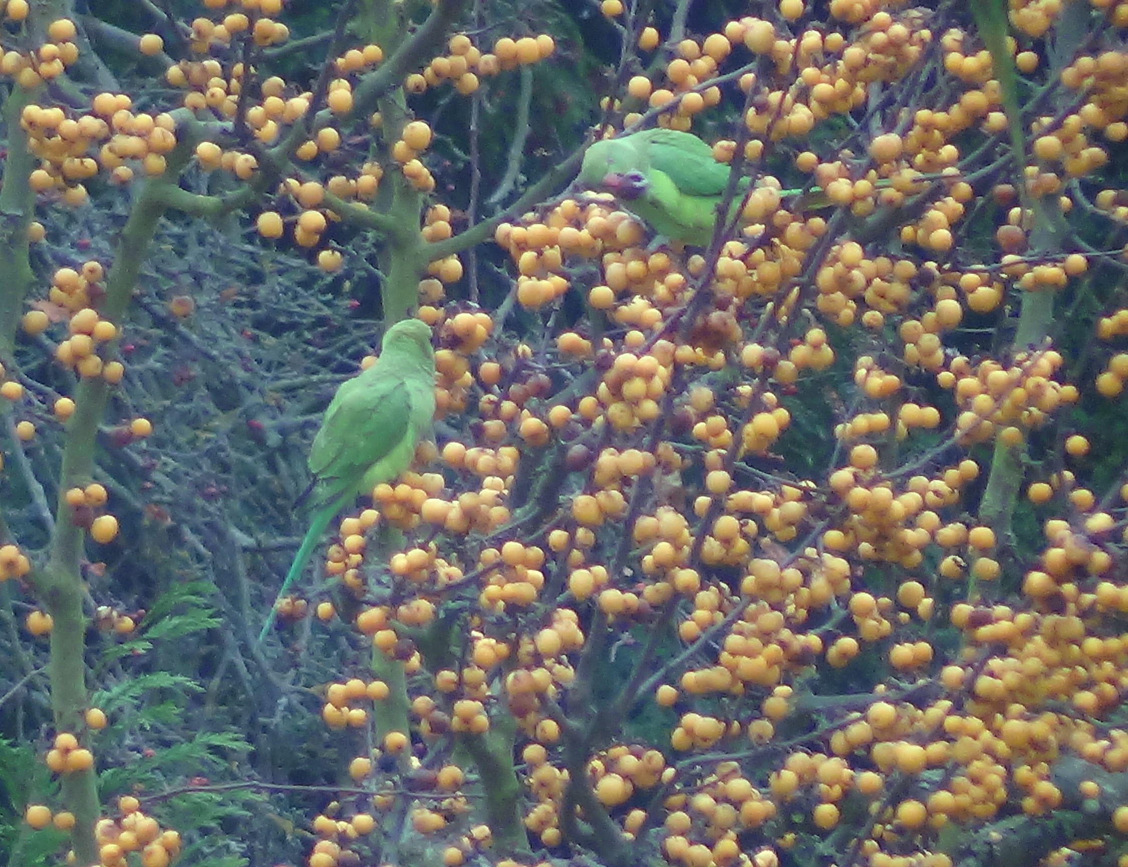 After having taken all the red berries the parakeets are now starting on the yellow berries. I read an article a couple of weeks ago that this is a repeatable phenomenon and that berry eating birds will always take the red berries before the yellow berries. It is supposed that they associate the red colour with ripeness and so don’t take to the yellow berries until all the red ones in an area having been eaten.