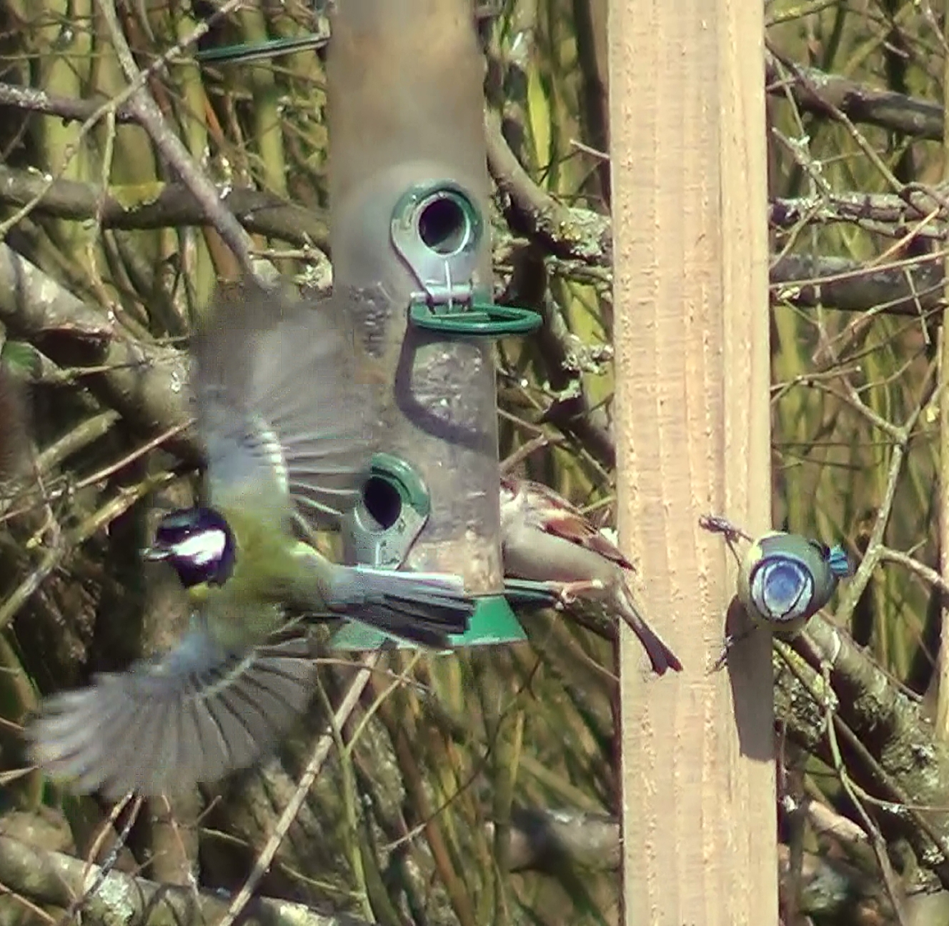 Compare the Great Tit (in flight) with the smaller Blue Tit on the post.
