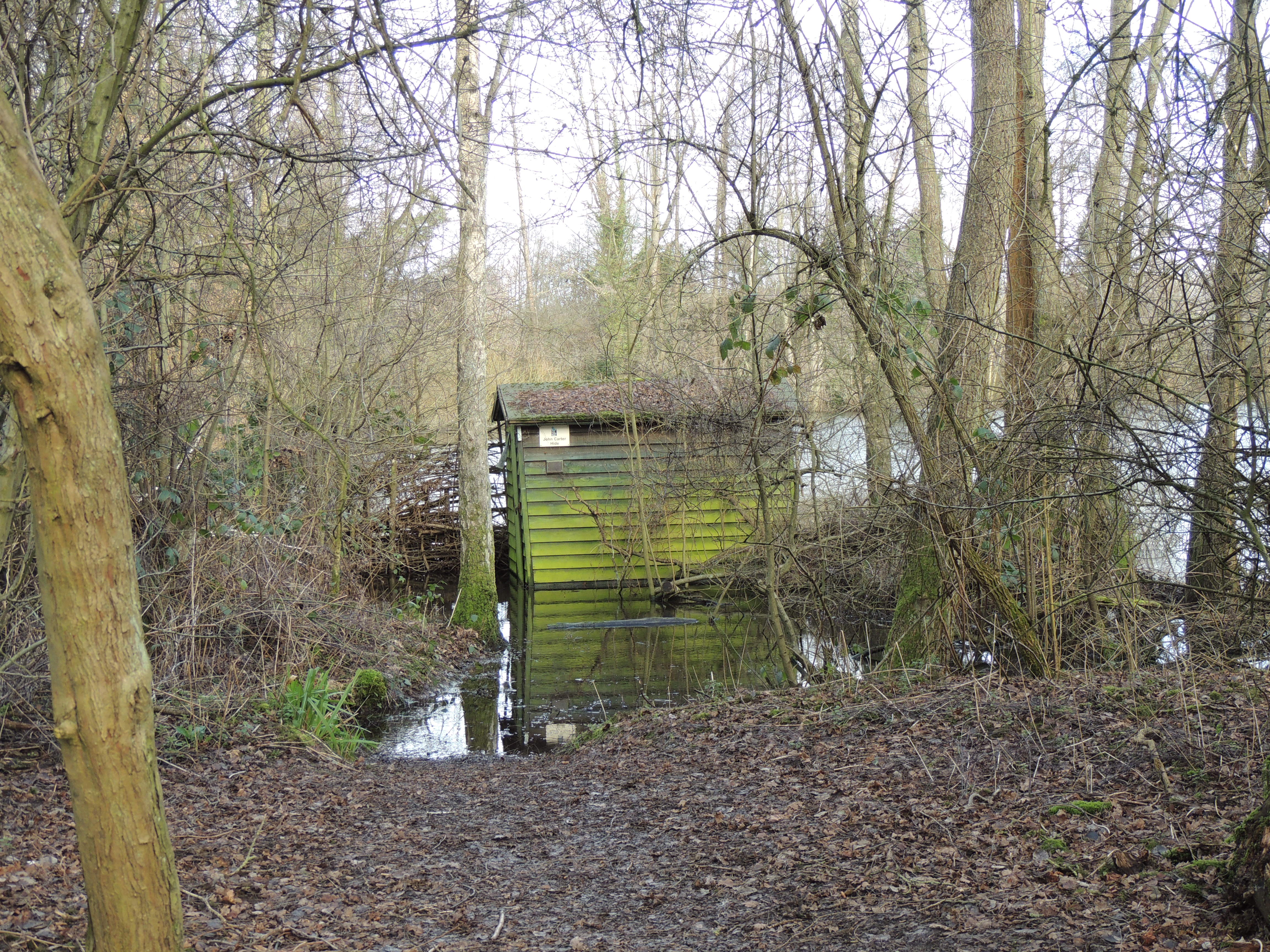 Next stop is Grebe lake. One of the highlights of the hide here is the feeding station which is alongside. This can be a very good place to get sightings and photographs of Siskin. However, this morning we are unluckily and only Blue and Great Tits are coming to the feeders. After a stop for a warming and refreshing cup of tea at the visitors centre, I make my way towards the northern part of the reserve. This path goes alongside the River Darent, which is much higher than usual and in some places is flooding over the path.