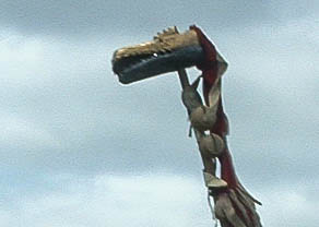 The ‘Draco’ was part of a Roman military standard. It was initially used by the cavalry as they charged into battle, but over the course of time came to be used by other units in the Roman army. From written and pictorial sources we know that it consisted of dragons head which was mounted upon a pole and from the head a ‘body’ made of some form of fabric was attached. From these sources we also know that as it was carried into battle on horseback this body would stream out behind the head. However, perhaps the most fascinating thing about the Draco are the references to the noise that it made as the air passed through the head.