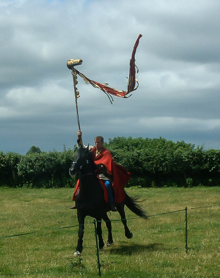When it came to the noisemaker, the archaeologists were firmly in the dark. There are no clear references in the written or pictorial evidence as to what made the sound. In examining the excavated examples, it did not appear that the Draco head had any fittings apart from those which attached it to its pole. This suggested that the noisemaker s were not fitted to the head and so the logical conclusion that follow from this work that they were fitted to the pole. After experimenting of a number of different types of whistles the team settled on Chinese kite whistles, which themselves date from ancient times. It is known that examples of these whistles traveled into Western Europe in ancient times and so these seemed a plausible method to choose. During the experiments, these were initially fitted on the pole inside the head, but due to the reduced airflow they made no sound whatsoever. An alternative was sought and they were re-positioned on the pole just below the head. This proved a great success as even if the horse was walking, a good sound could be heard if the wind was in the right direction. At a gallop into the wind it was found that the sound can be heard above horse’s hooves at a distance of at least 200 m.