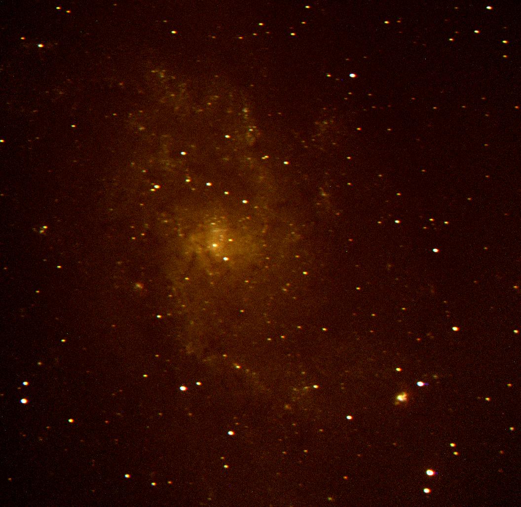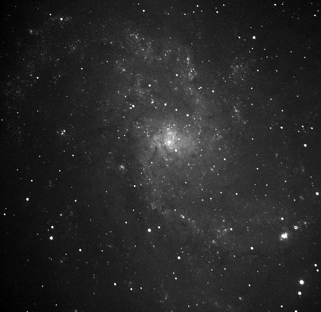 The Triangulum Galaxy (AKA Messier 33 or NGC 598) is a spiral galaxy at a distance of 3,000,000 light years from the Earth. it is also sometimes known as the Pinwheel Galaxy, although this is rather confusing as this name is also used for Messier 101. It was first documented by Hodierna in 1654 and under good conditions can just about be made out with the naked eye. The Galaxy is 50,000 light years in diameter and is estimated to contain approximately 40,000,000,000 stars. It has a close, although not well defined, association with the Andromeda Galaxy. Some astronomers believe that the two may have collided in the past, whilst others believe that a collision between the two galaxies will occur sometime in the future.