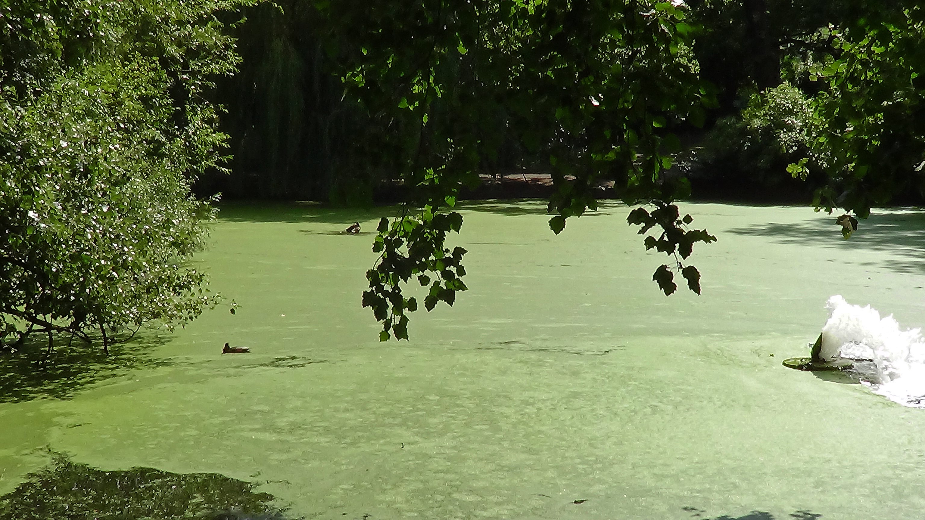 Very little in the natural world is absolute. Take the hot weather we are experiencing in Southern England at the moment. Great for the Butterflies and Dragonflies. But it does have its drawbacks as witness my visit to the tarn yesterday. The hot weather has caused a bloom to appear on the lake.