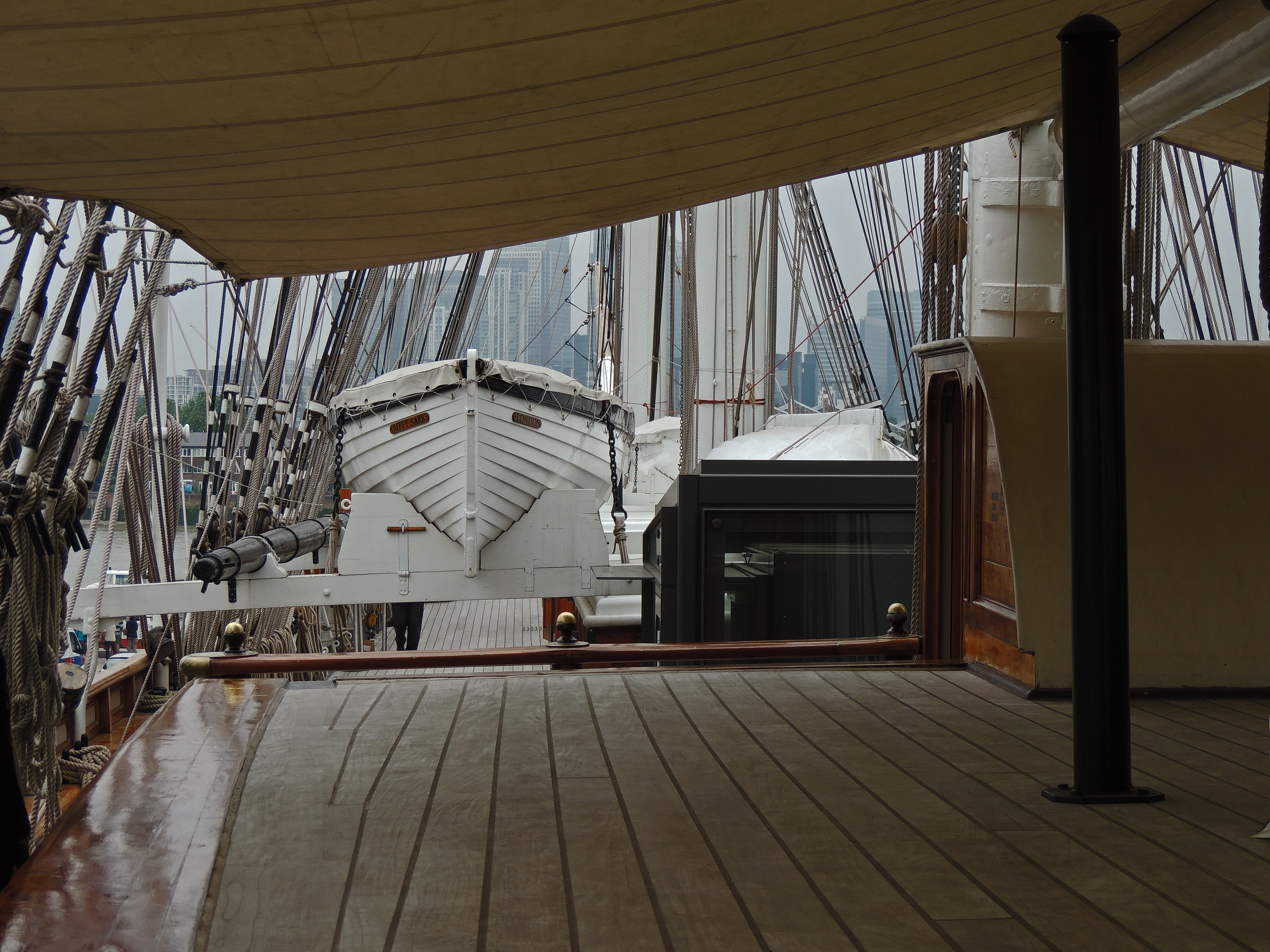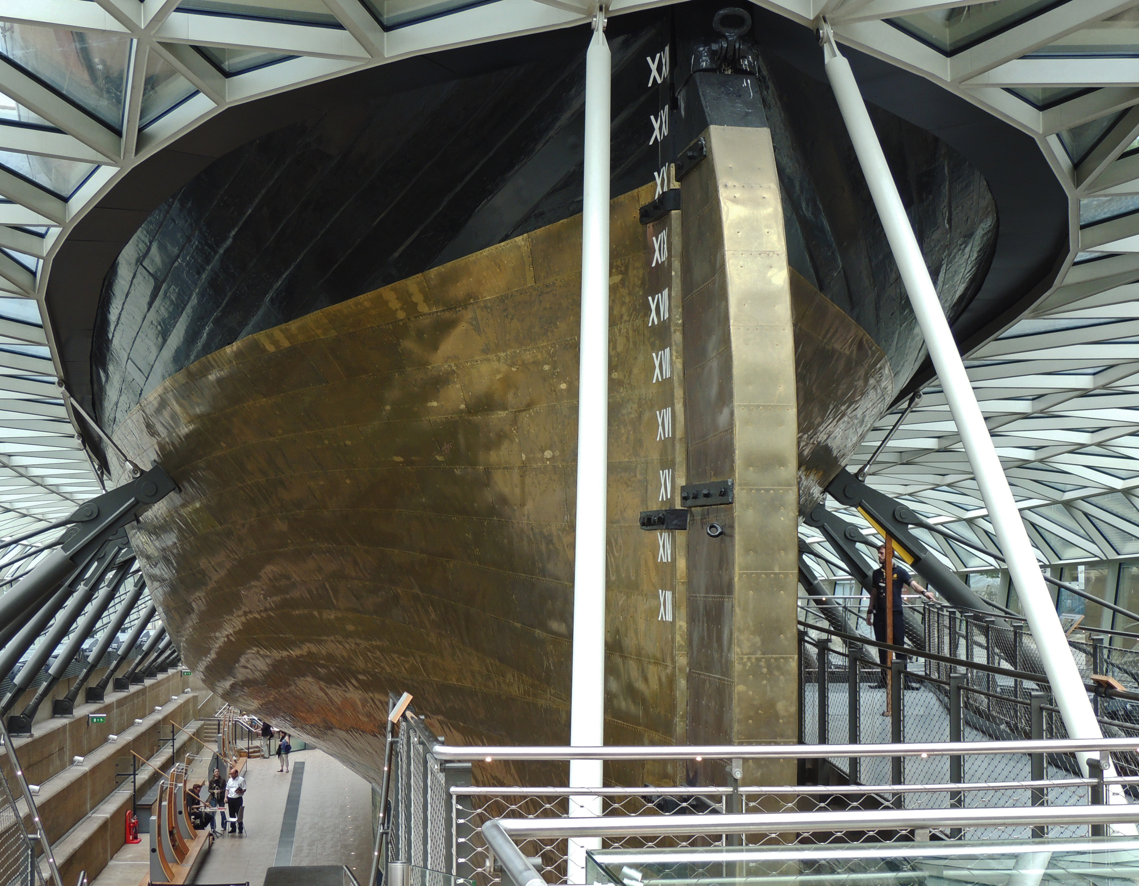 The Cutty Sark was built for speed and nowhere do you get a better feeling of this than when looking at her in profile. The new display arrangement by which the ship is suspended enables you to get a real idea of how the keel would cut through the water.