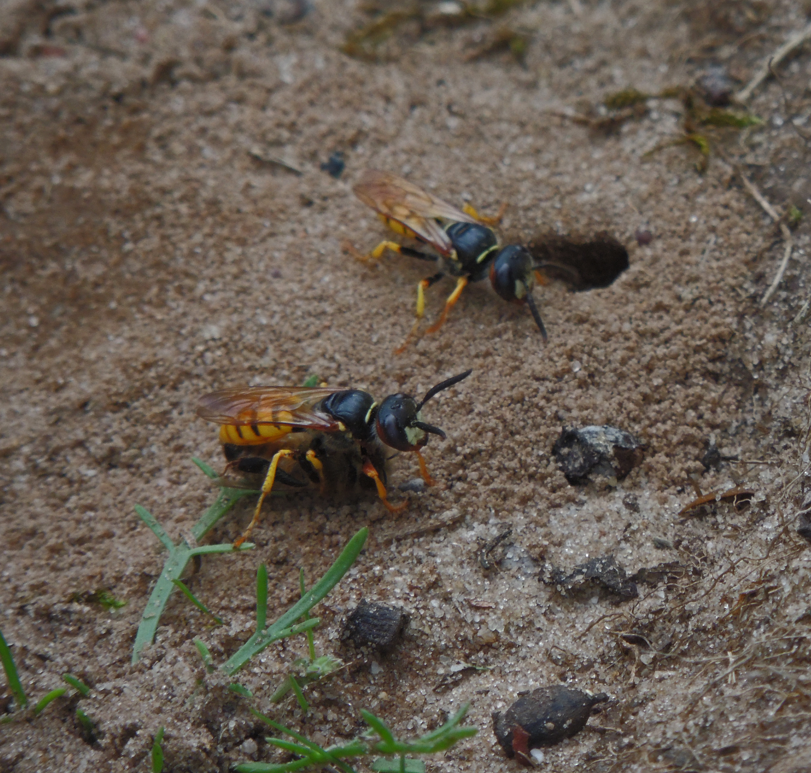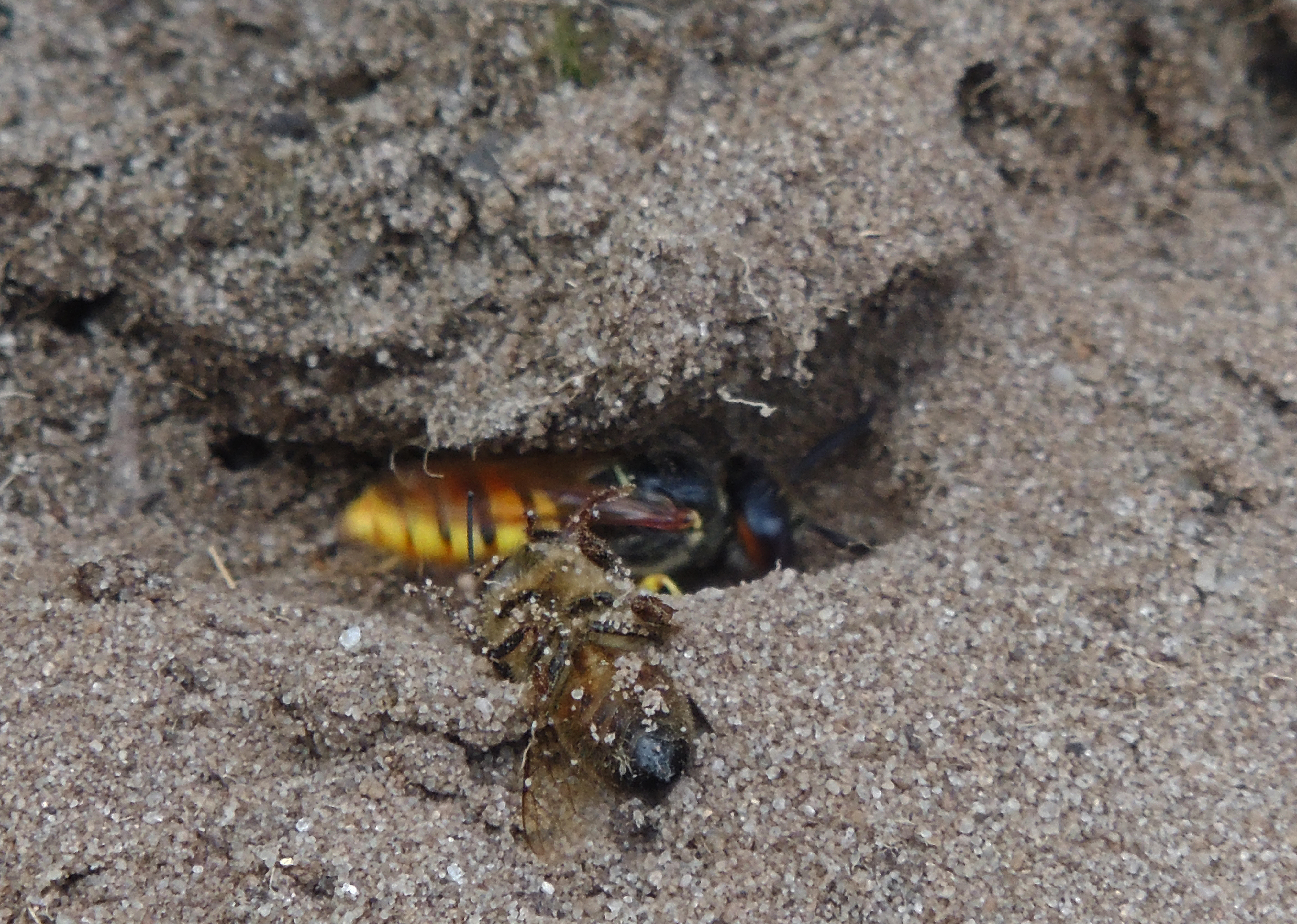 The species found in the UK targets Honey Bees, the females dig tunnels in the sand, whilst the males hunt Bees.