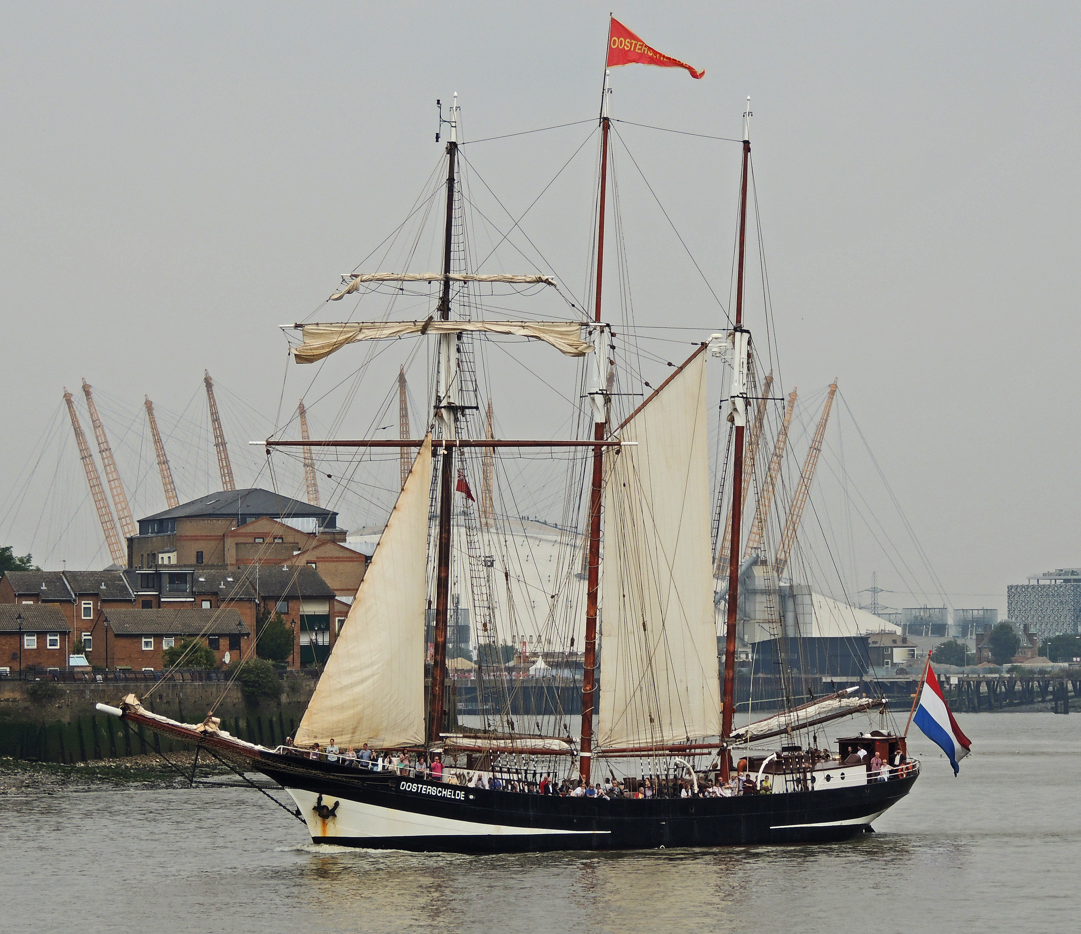 Oosterschelde passes Greenwich with the Greenwich Dome in the background.