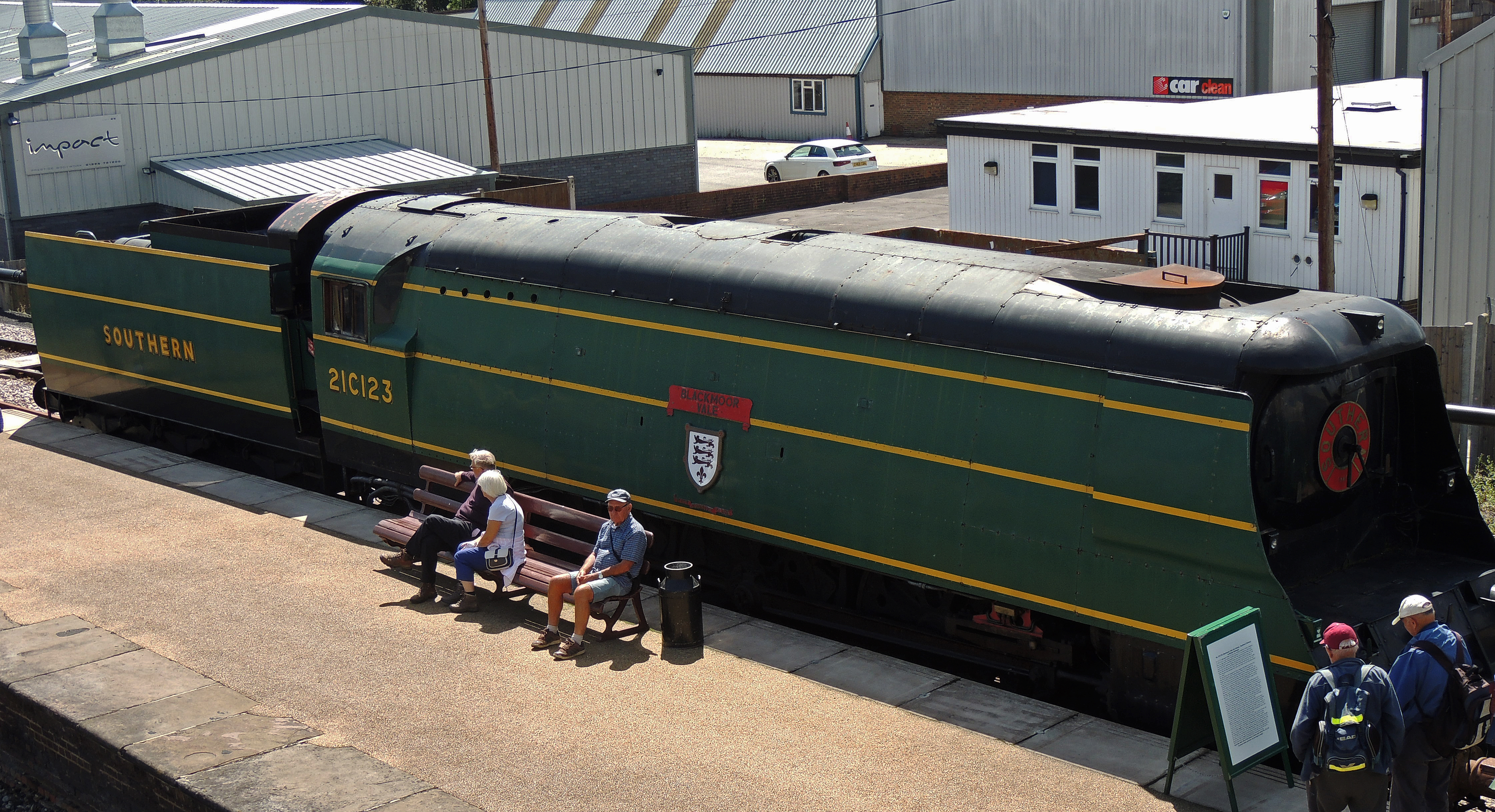 34023 (21C123) Blackmore Vale is an example of the bullied Light Pacifics (West Country Class). She was built in 1946 in Brighton and pulled passenger services from the Kent coast to London, being initially based at Ramsgate and then at Nine Elms in London. In 1950 she was transferred to Salisbury and then to Exeter before going to Eastleigh in 1964 and finally back to Nine Elms. 34023 was purchased from BR after withdrawal by a group of drivers from Nine Elms depot who wanted to preserve Southern steam locomotives and was sent to the Longmoor Railway, but when this closed in 1971 she was transferred to the Bluebell Railway
