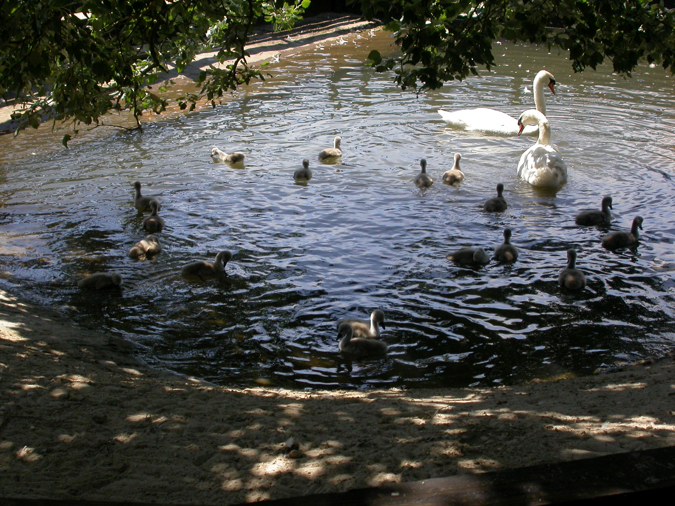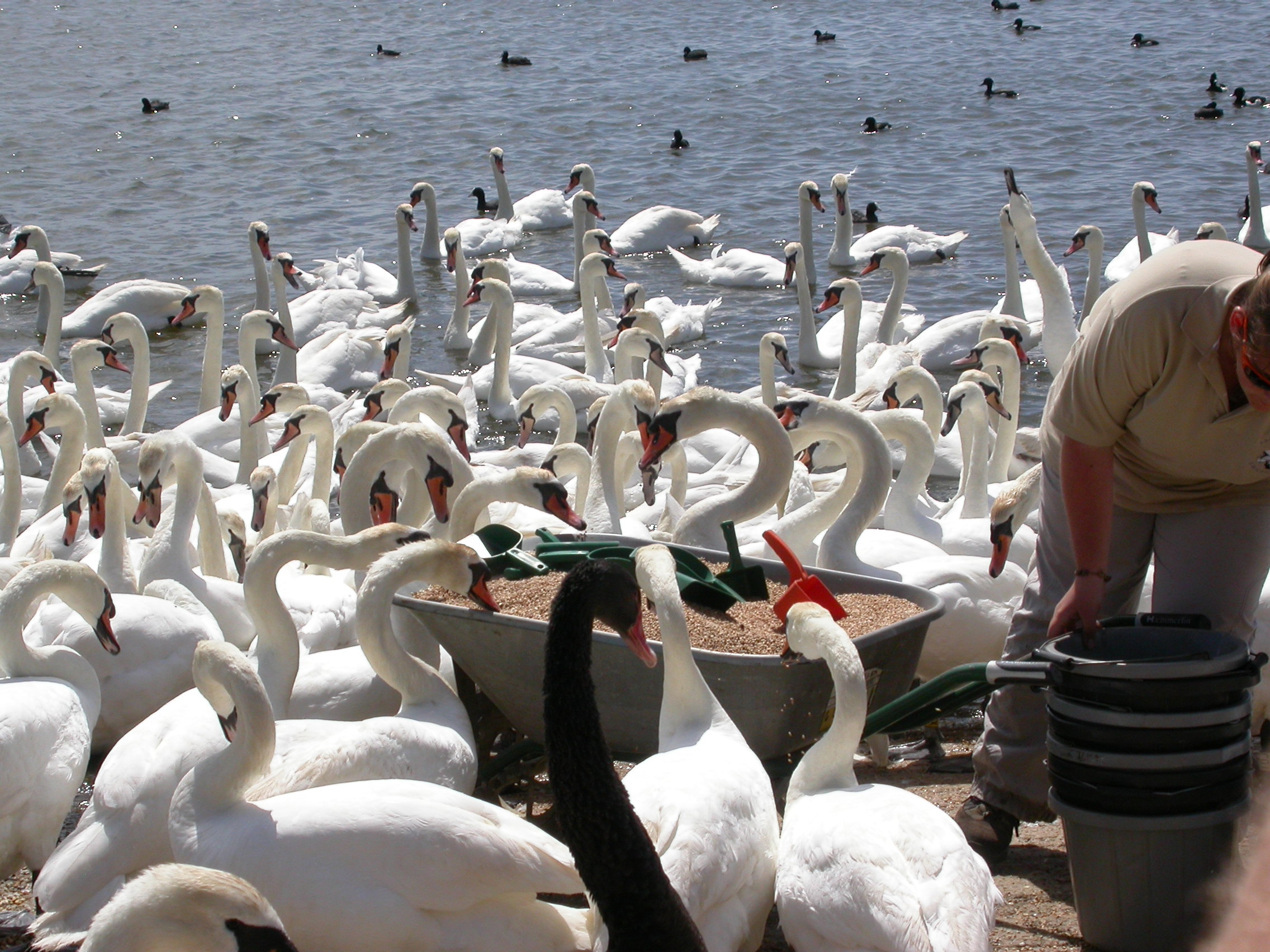 Feeding time at the Swannery is a boisterous affair although some Swans are not prepared to wait and go straight to the source.