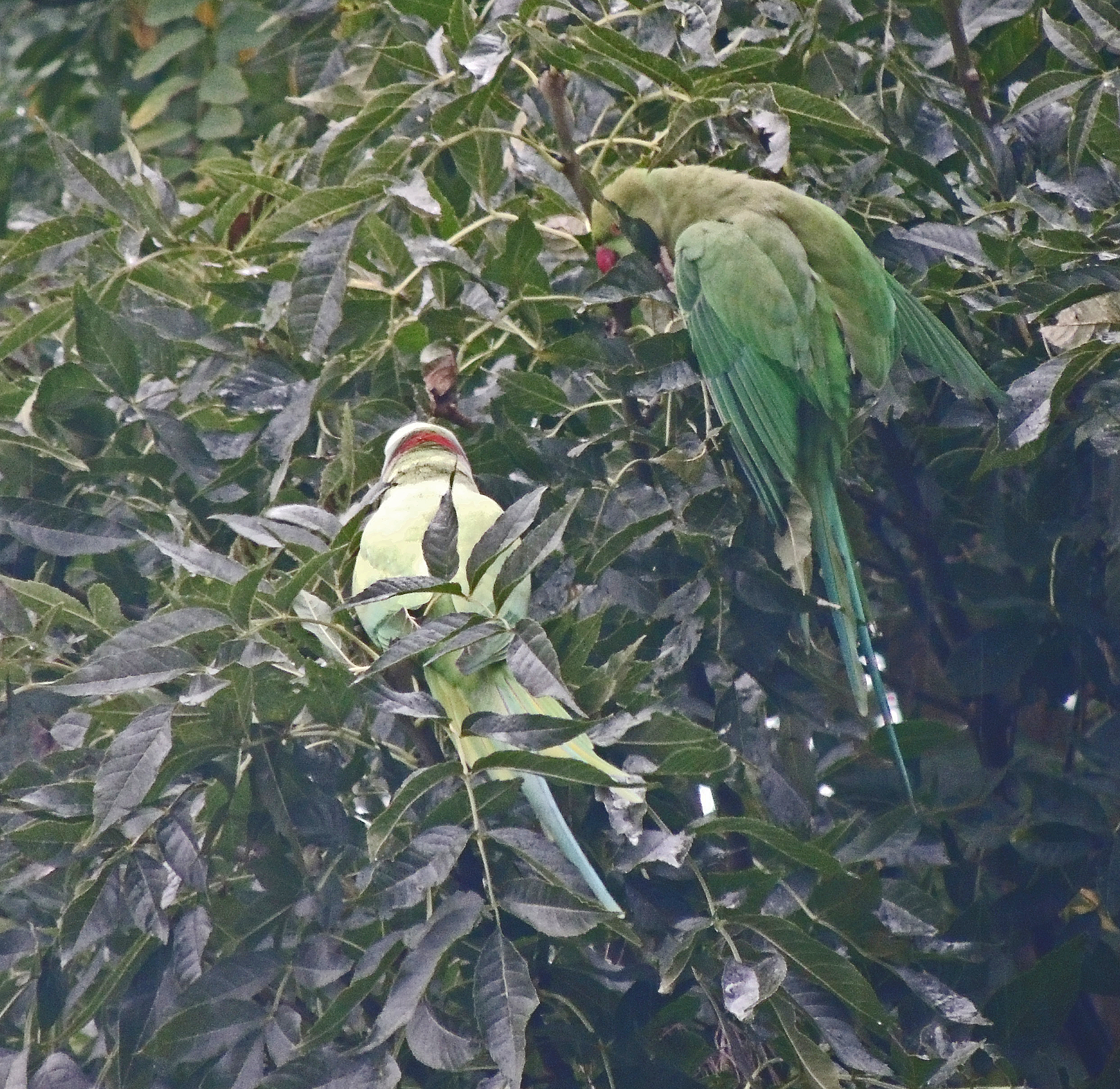 The numbers of Ring-necked parakeets are beginning to climb particularly parties travelling into the roost site (about 2 miles away) in the evening, but also during the day the parties hanging around the garden are increasing in size. I like the picture below as it is the first I have managed to take which shows the rose coloured ring on the neck which gives them their alternate name of Rose-Ringed Parakeet.