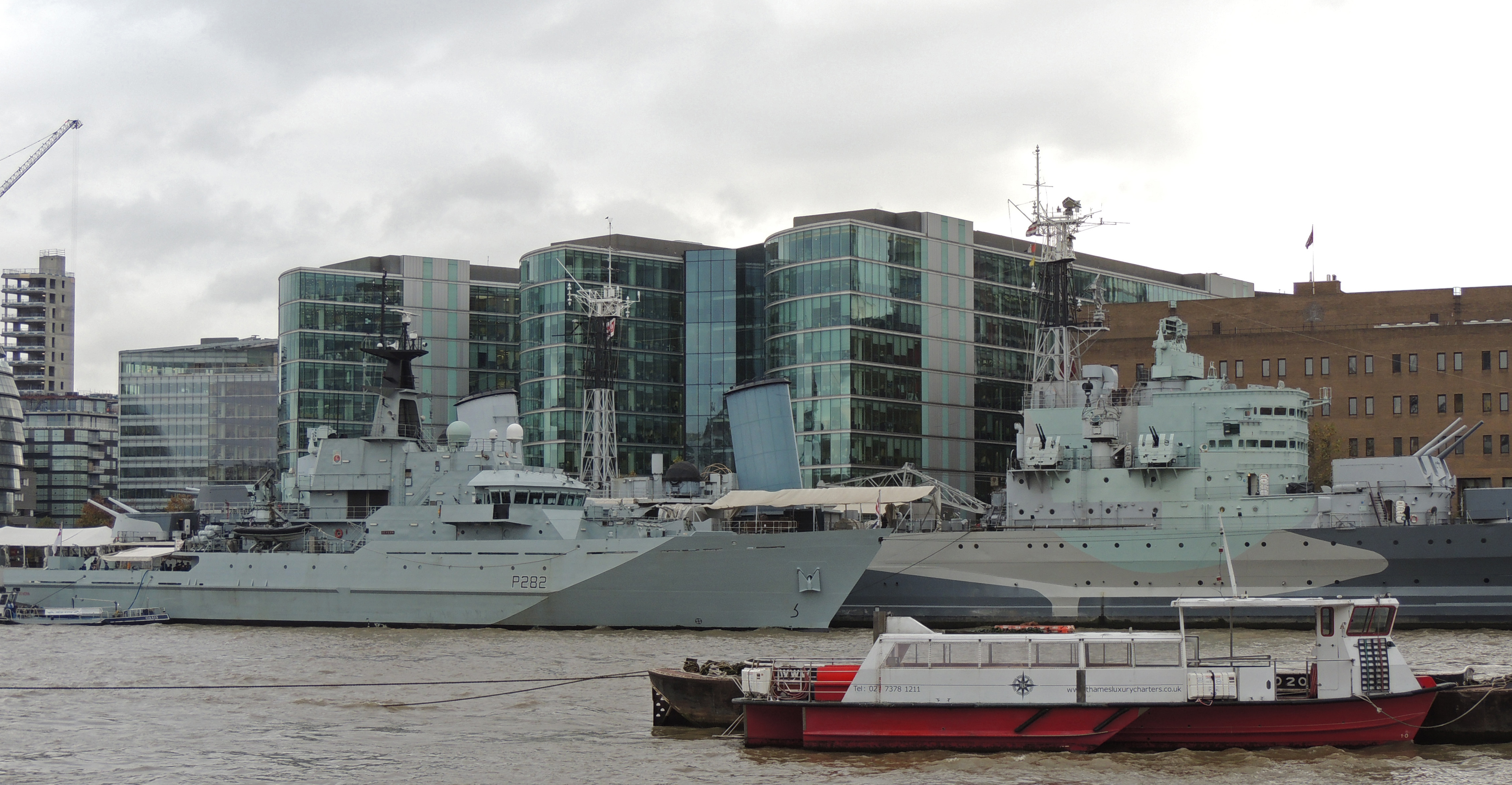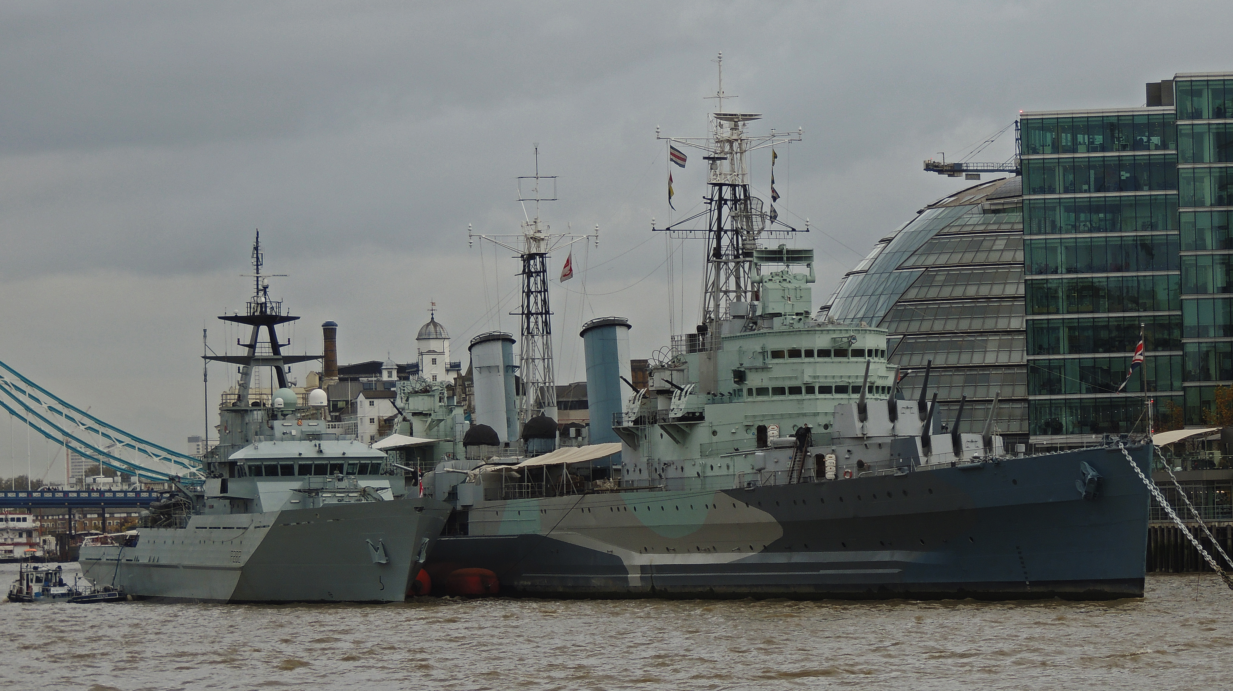 There followed a period of indecision as to her future but eventually it was decided to form an independent trust to operate the ship as a museum in the pool of London. It opened to the public in 1971 and ownership was transferred to the Imperial War Museum in 1978. It also serves as a mooring place for naval ships visiting the pool of London. On the day of our journey, HMS Severn a Royal Navy patrol vessel was moored alongside.