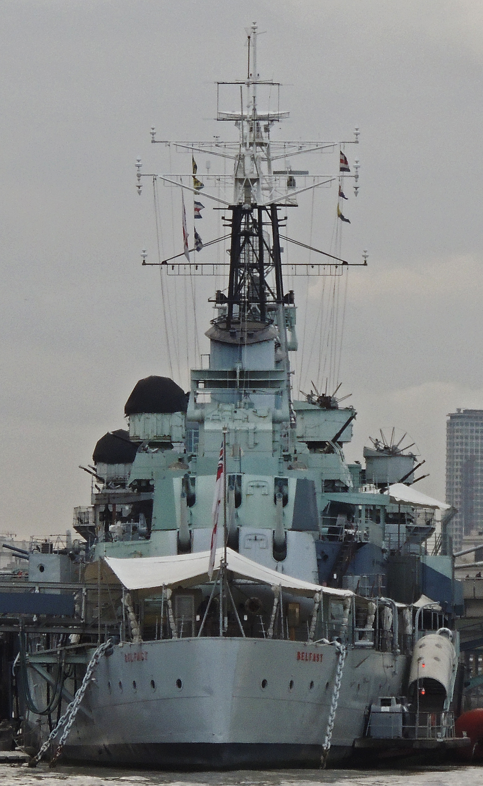 HMS Belfast is a cruiser launched just prior to the second world war in 1938. Shortly after the outbreak of hostilities she struck a German mine and was in dock undergoing repairs for 2 years. In 1942 she was appointed to the fleet guarding the convoys in the Arctic and in 1944 she supported the landings on the Normandy beaches. In 1945 she was transferred to the far eastern fleet. She was retired from active service in 1963.