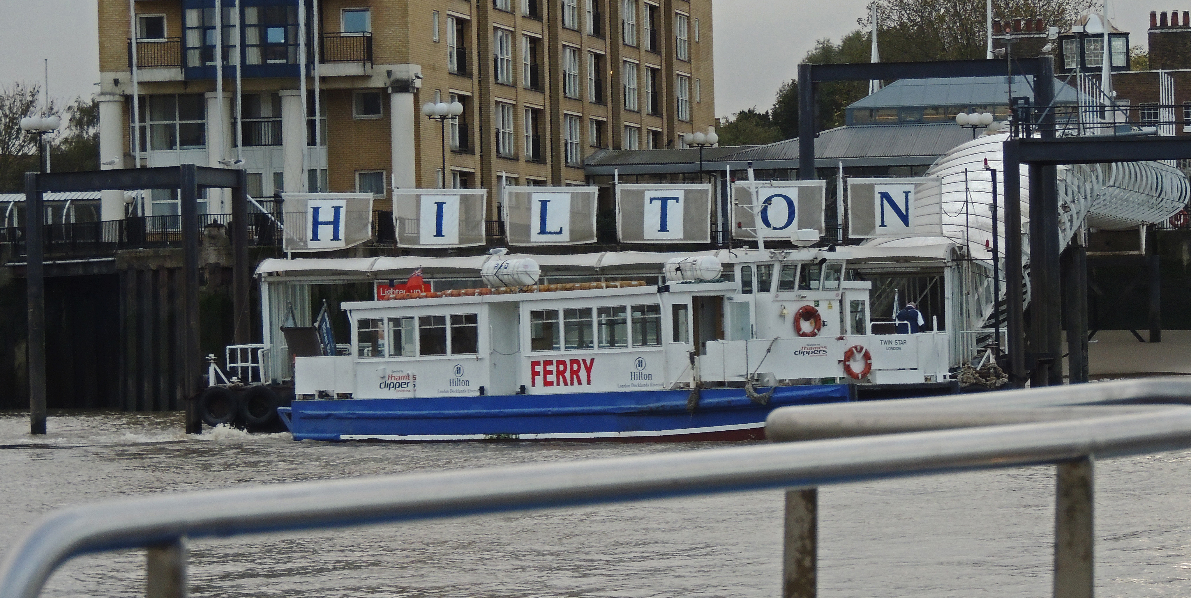 The Hilton ferry is the only passenger ferry operating on the Thames that connects two points, one on the south bank near the Hilton Docklands Hotel and Canary wharf on the north bank (All other services are river boats and connect multiple along a route).