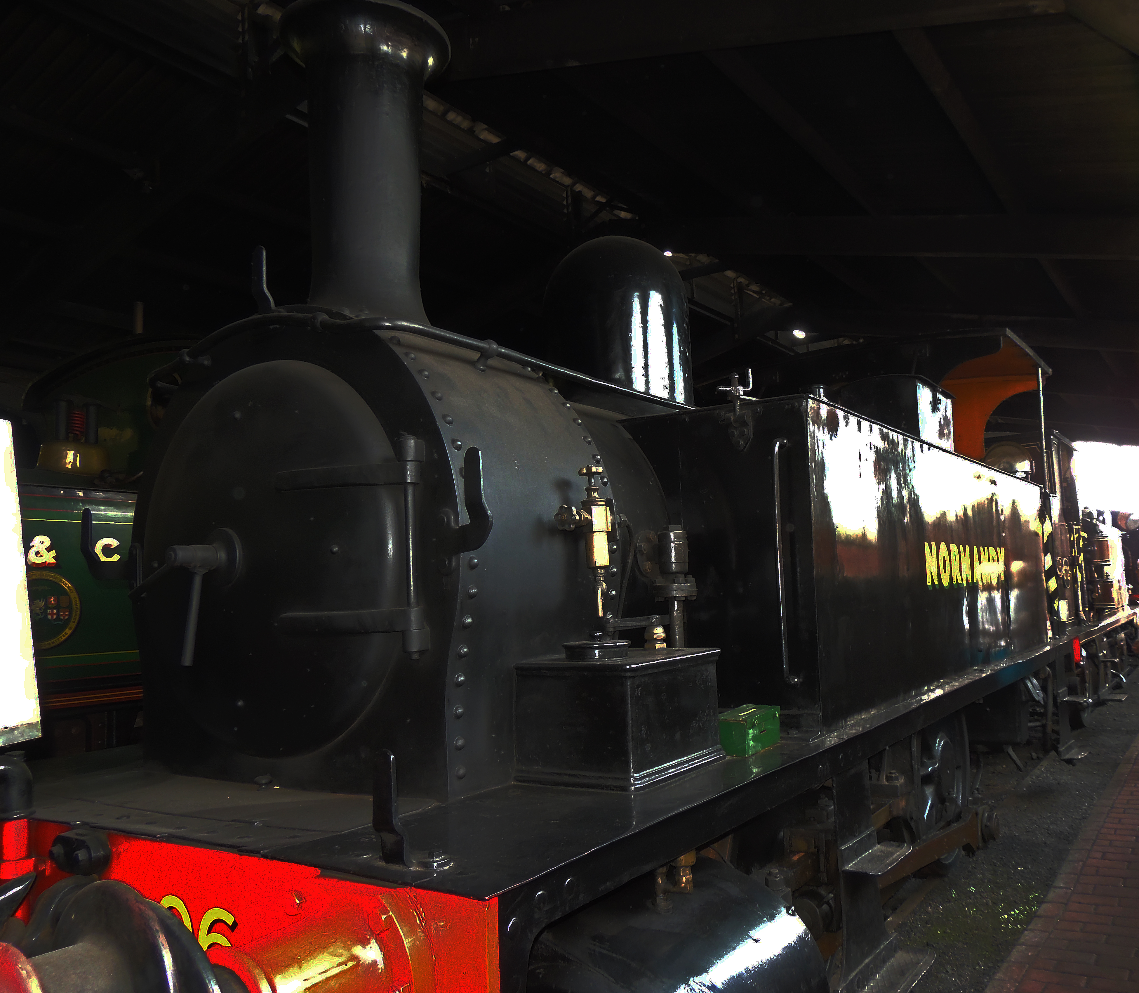 Normandy is an example of a B4 class engine. These were very powerful steam shunting engines. It was built in 1893 and worked for most of its life in Southampton Docks. When surplus to BR requirements it continued in this role working for a private company within the dockyard.