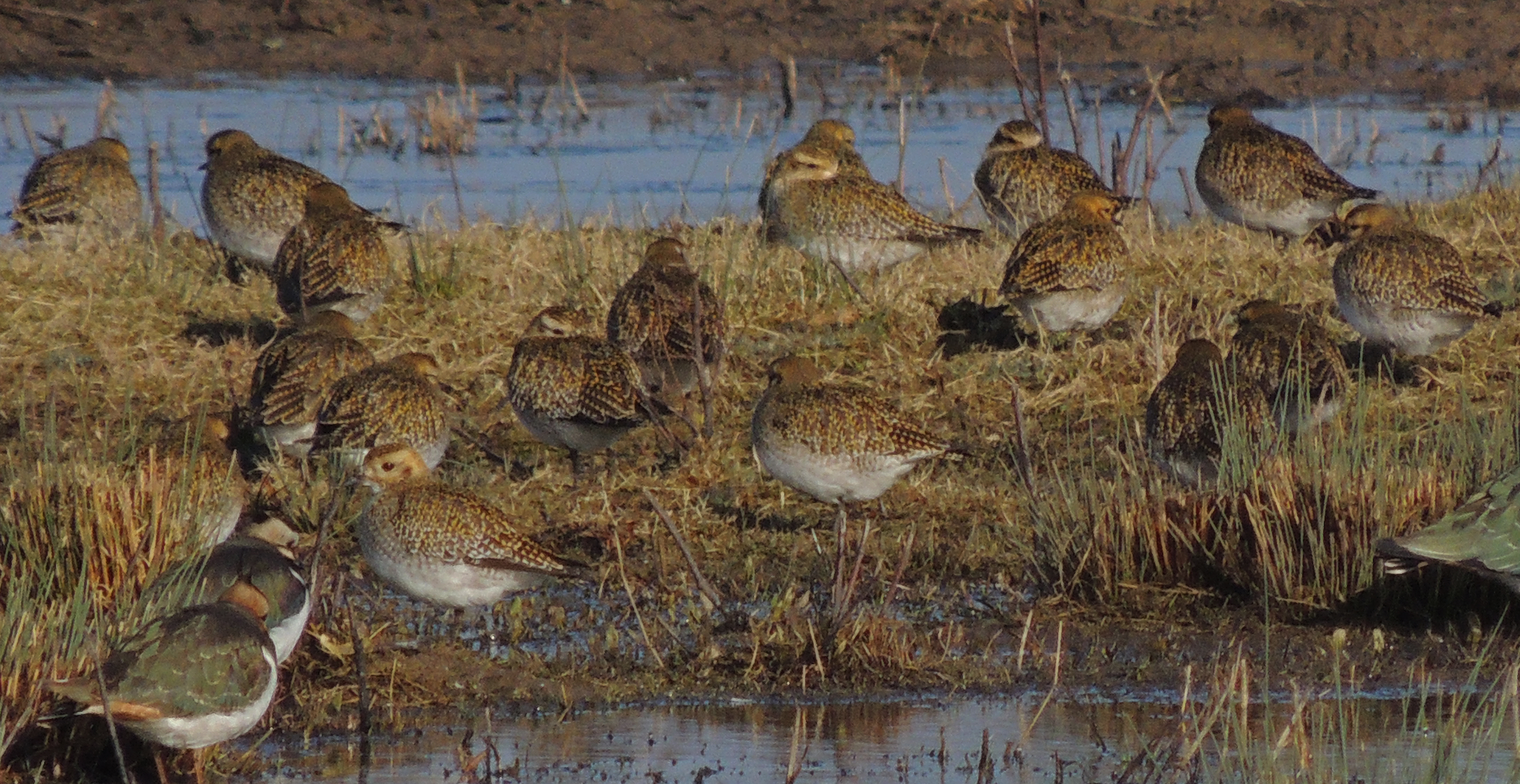 The weather is dull and overcast although the sun occasionally breaks through as I begin my circuit of the reserve. The feeders by the visitor have good numbers of House Sparrows, a once common bird which has declined in recent years. I first go to the Purfleet hide to see the large group of waders which has gathered in front of it. These turn out to be Golden Plover and Lapwing.