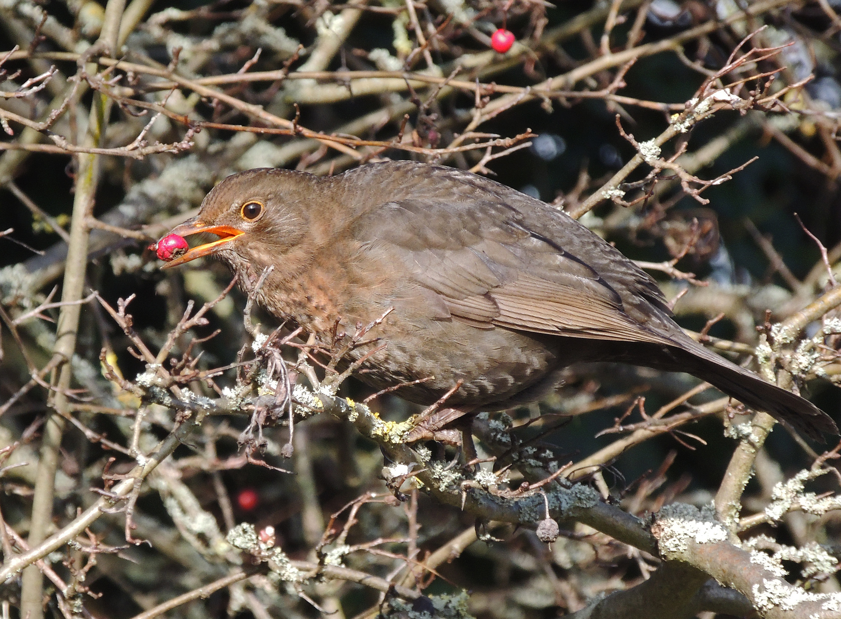 In the woodland I come across a female Blackbird busily gorging herself on berries who seem oblivious to my presence.