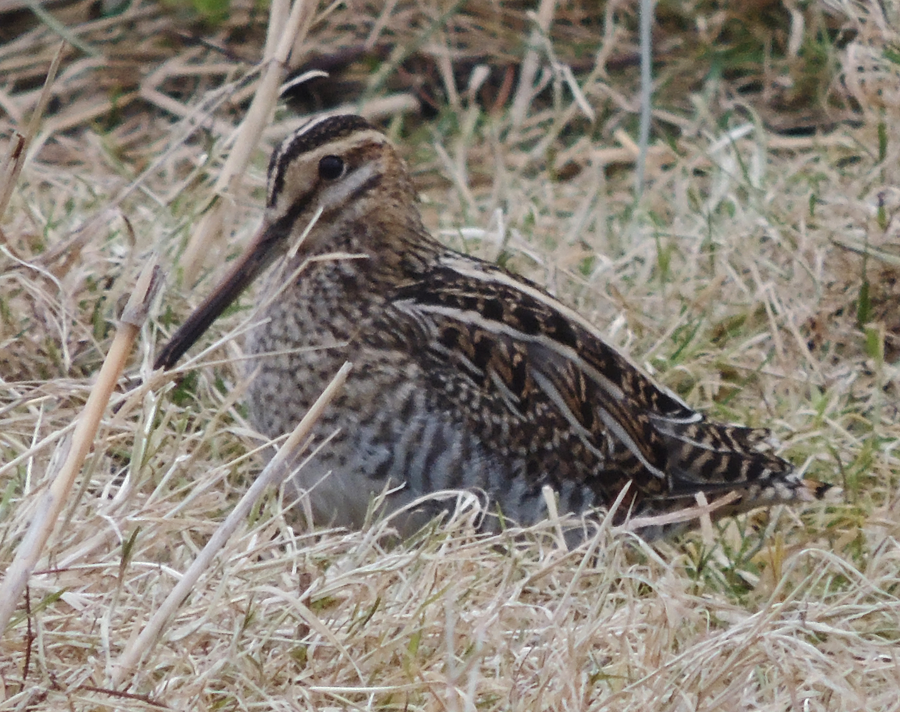 Looking alongside the hide I see a bird moving in the grass and closer inspection reveals it to be a Common Snipe which obligingly poses for photos before moving off.