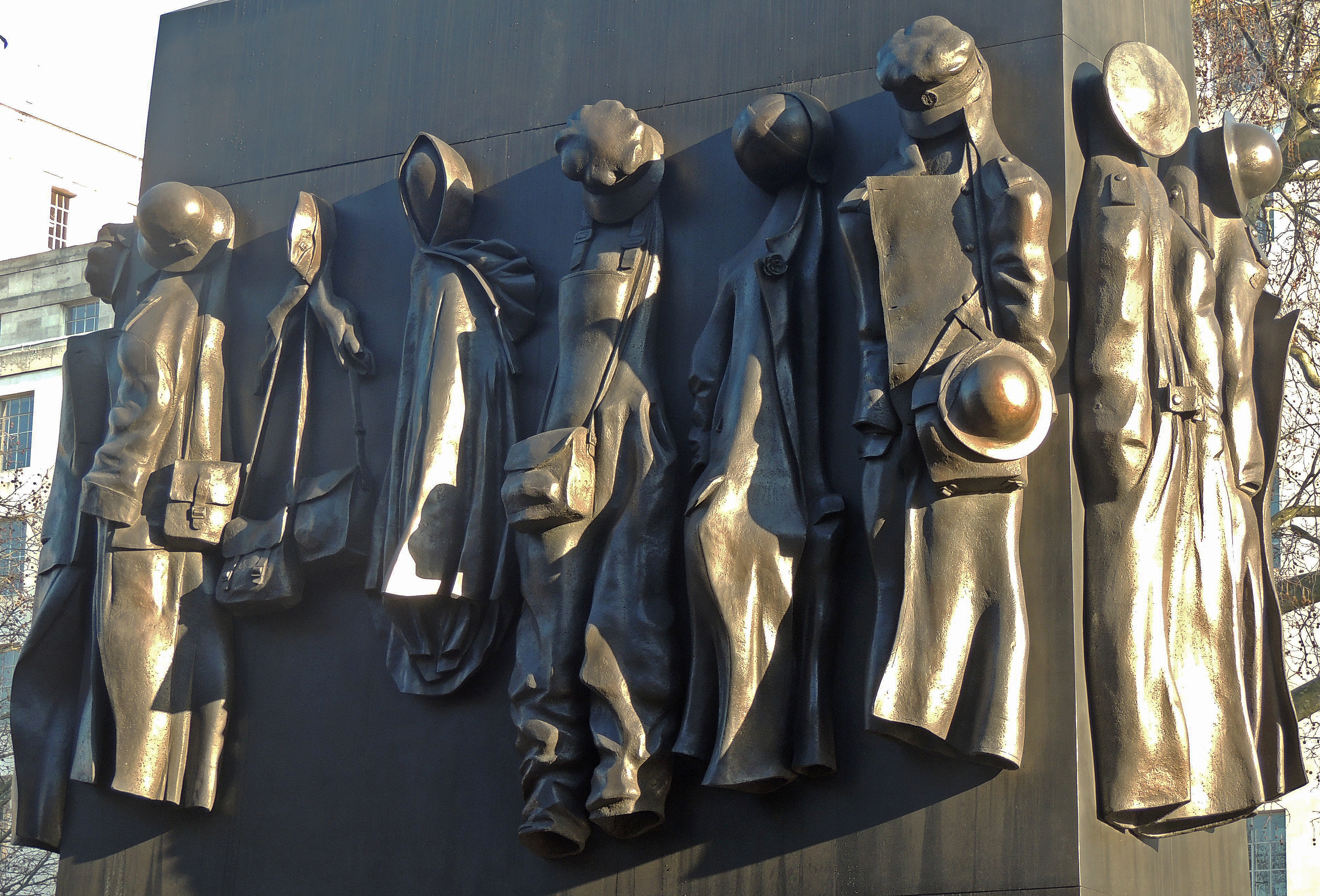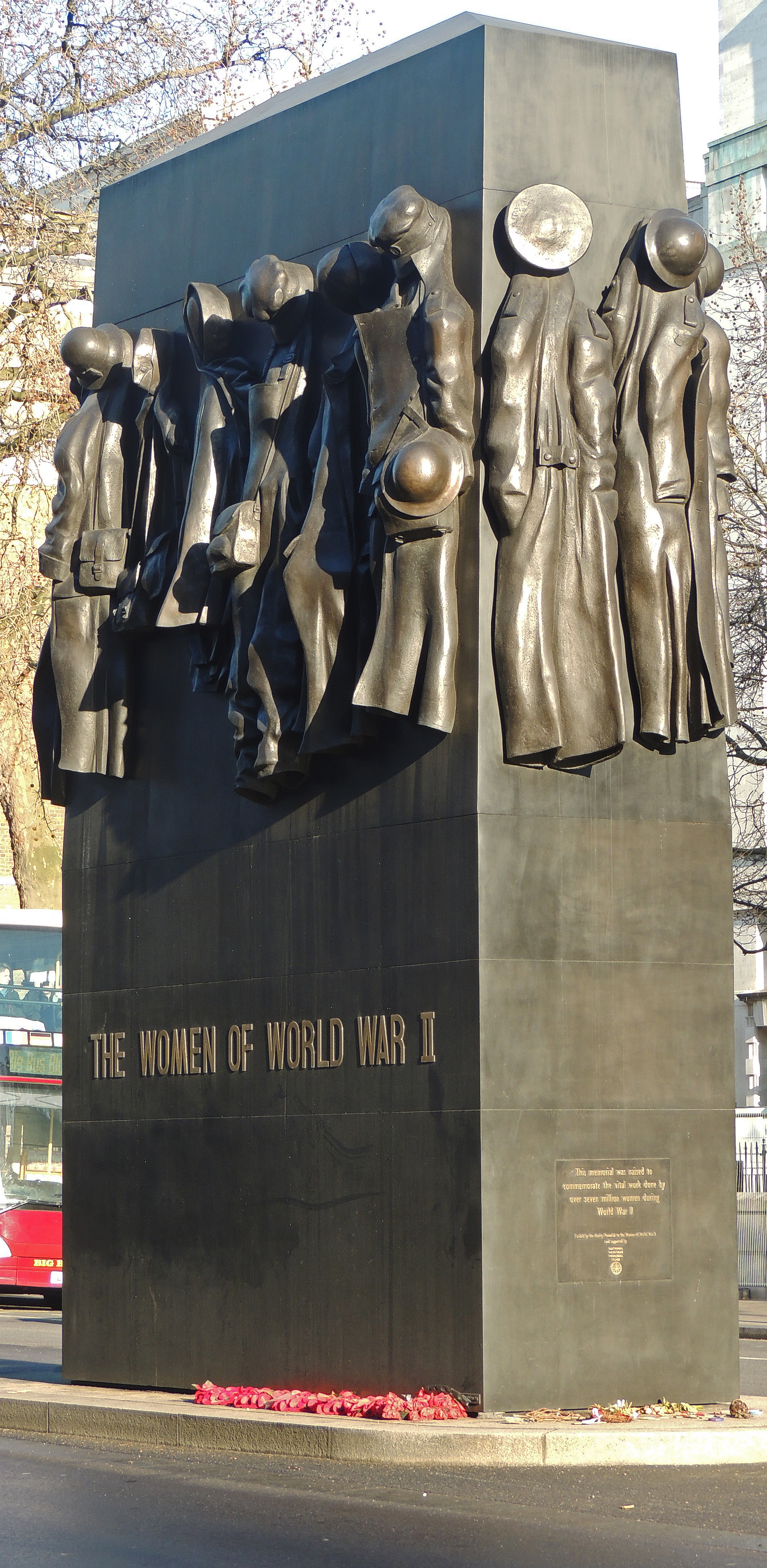 This monument which stands in Whitehall to the North of the Cenotaph was unveiled by Queen Elizabeth II in 2005. It is by John W Mills and is dedicated to the many women who took part in the World War.