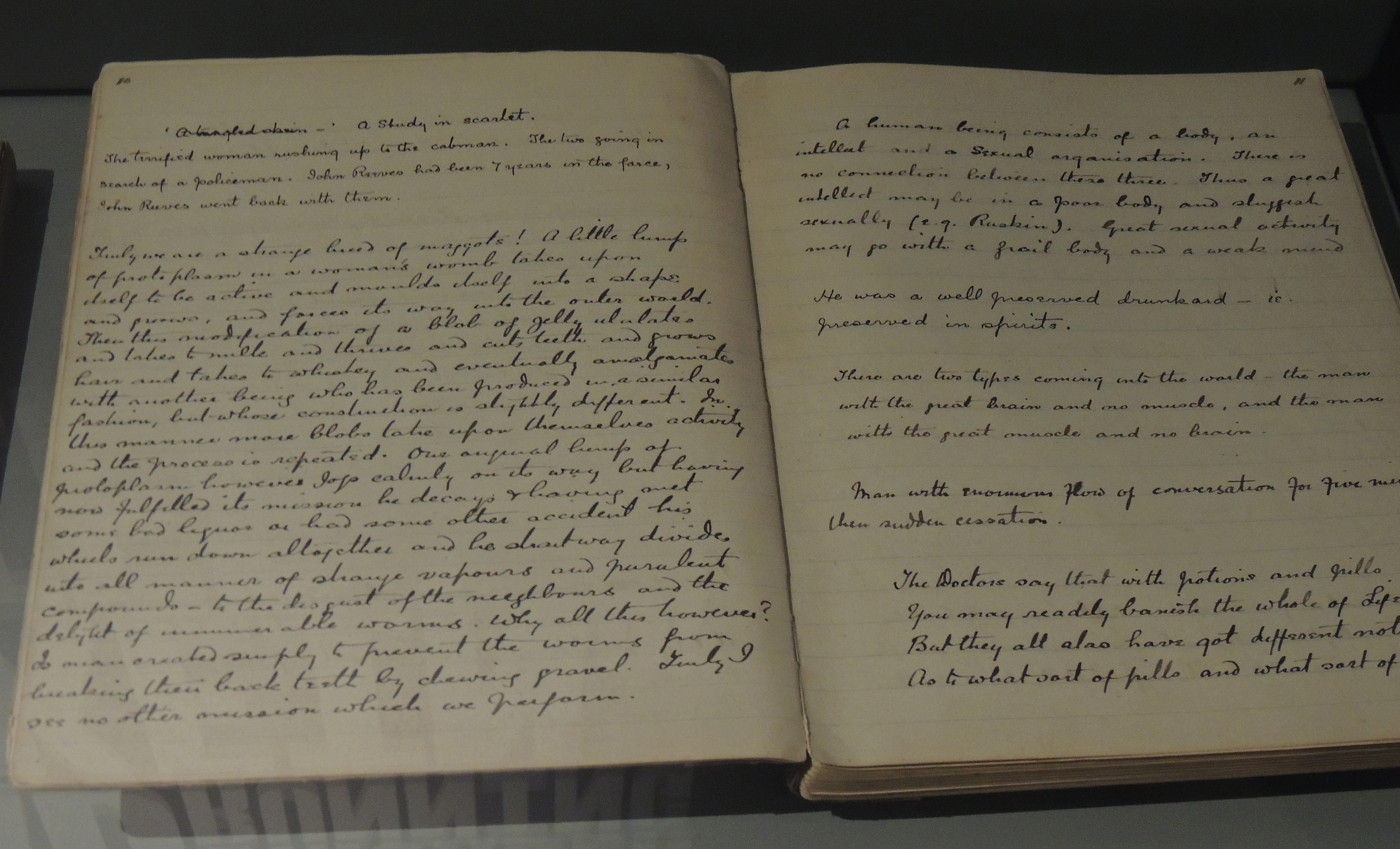 Entering into the exhibition area trough a book case you are immersed into the world of Sherlock Holmes and his creator Sir Arthur Conan-Doyle. Included in the exhibition are Conan-Doyle’s original notebooks along with Sydney Paget illustrations together with a copy of the first Sherlock Holmes story to be published.
