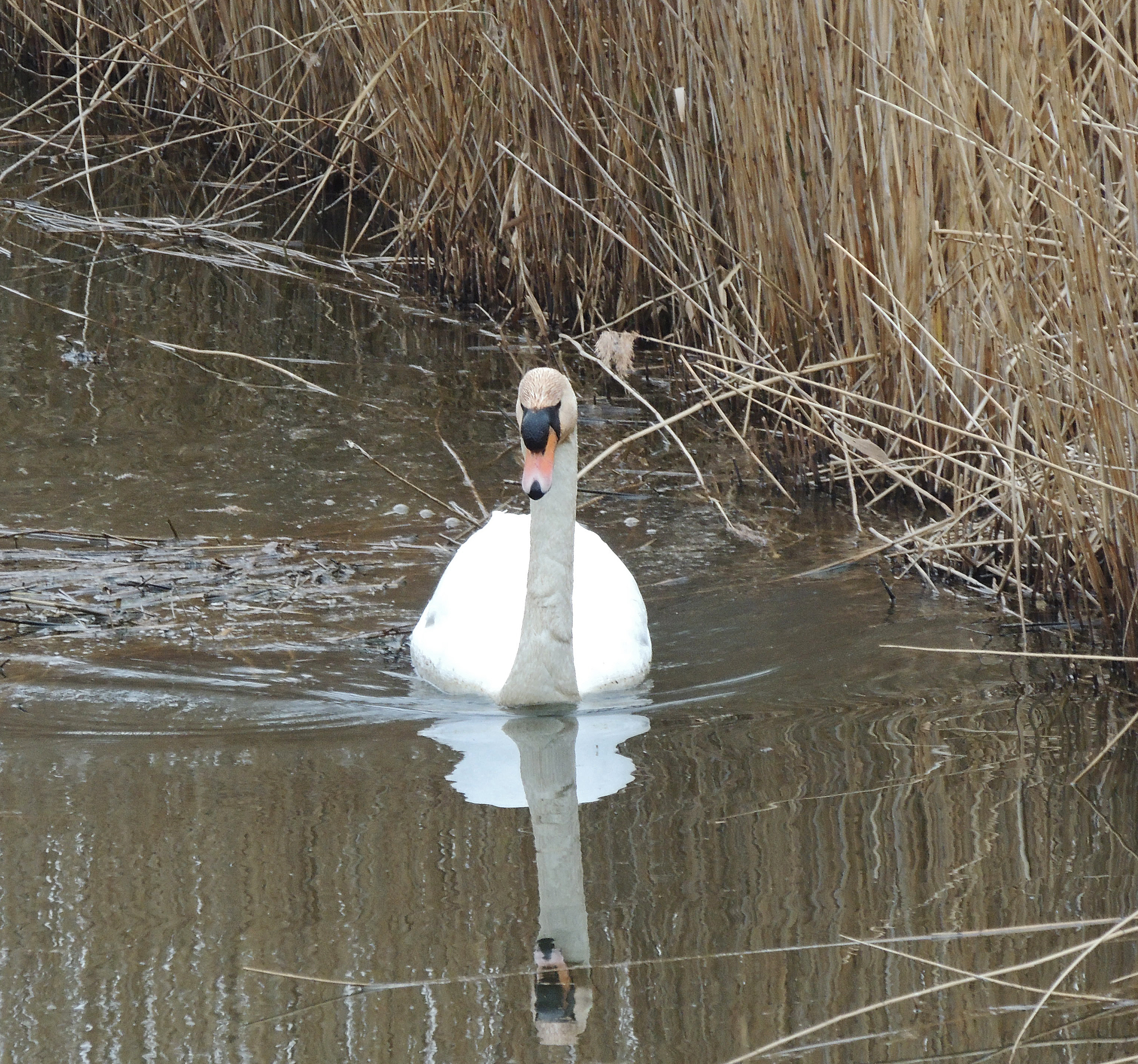 Our final stop is overlooking some pools in the reed-bed and some mud-flats. On the former there are two sleeping swans. Unfortunately they remain asleep covering all the necessary indicators of which species they are. Then they briefly raise their heads and it is clear from their yellow beak markings that these are two Whooper Swans, winter visitors who will soon be heading north to their breeding grounds. Before I can get a photo they resume their sleeping pose! On the mud-flats are Oystercatchers and Avocets.