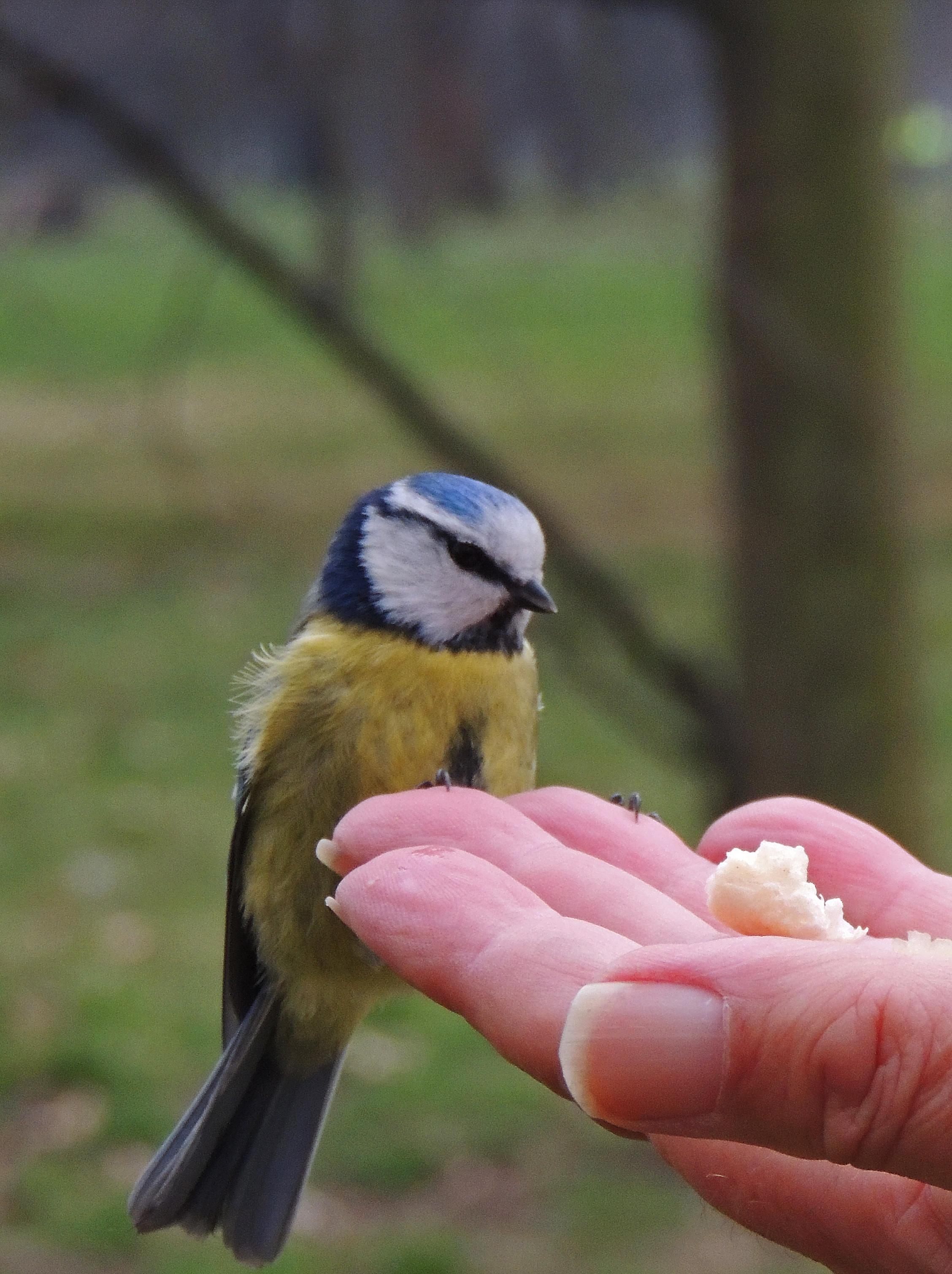Whilst we are looking for the Owl, Keith is buzzed by a Blue Tit and as we know that some people feed the birds here, we decide to give it try and are soon the centre of attention for a small group of Blue Tits and Great Tits.