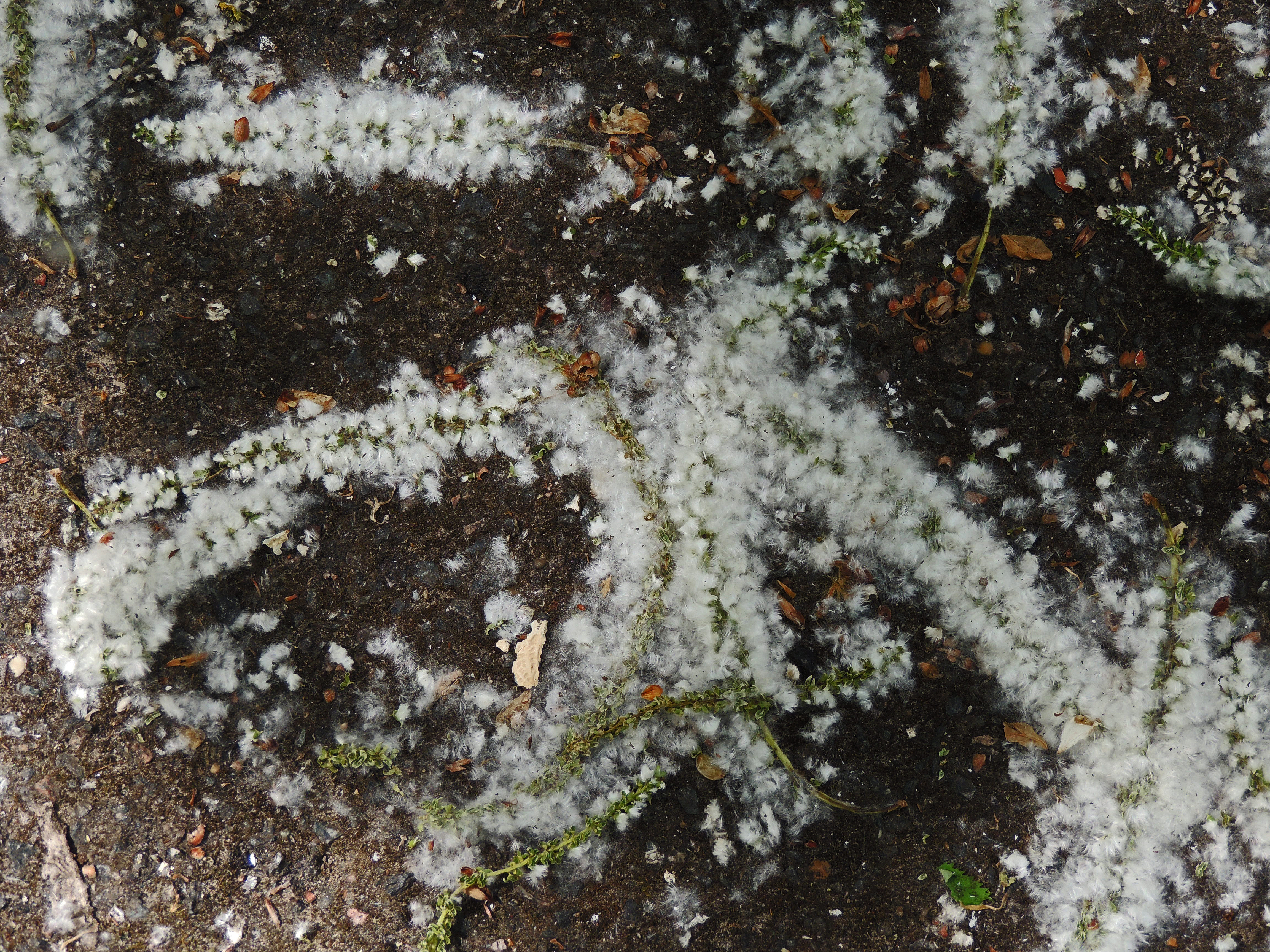 It looks like it has been snowing but it is actually a fall of seeds from one of the trees.