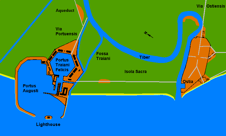 Around this were built a number of warehouses, which opened directly onto the quayside. Two of these have been noted to have raised floors, prompting suggestions that they were for the storage of grain. The second improvement project was the construction of the Trajanic canal , which ran from the mid-point of the Fossa Triana to the Tiber. Its function is not clear, although some historians have suggested that with the increased traffic, it may be that a one-way system was implemented with traffic going along the Trajanic canal in one direction and long the eastern half of the Fossa Triana in the opposite direction. The third large improvement project was the construction of a direct road link between Portus and the city, the Via Portuensis.