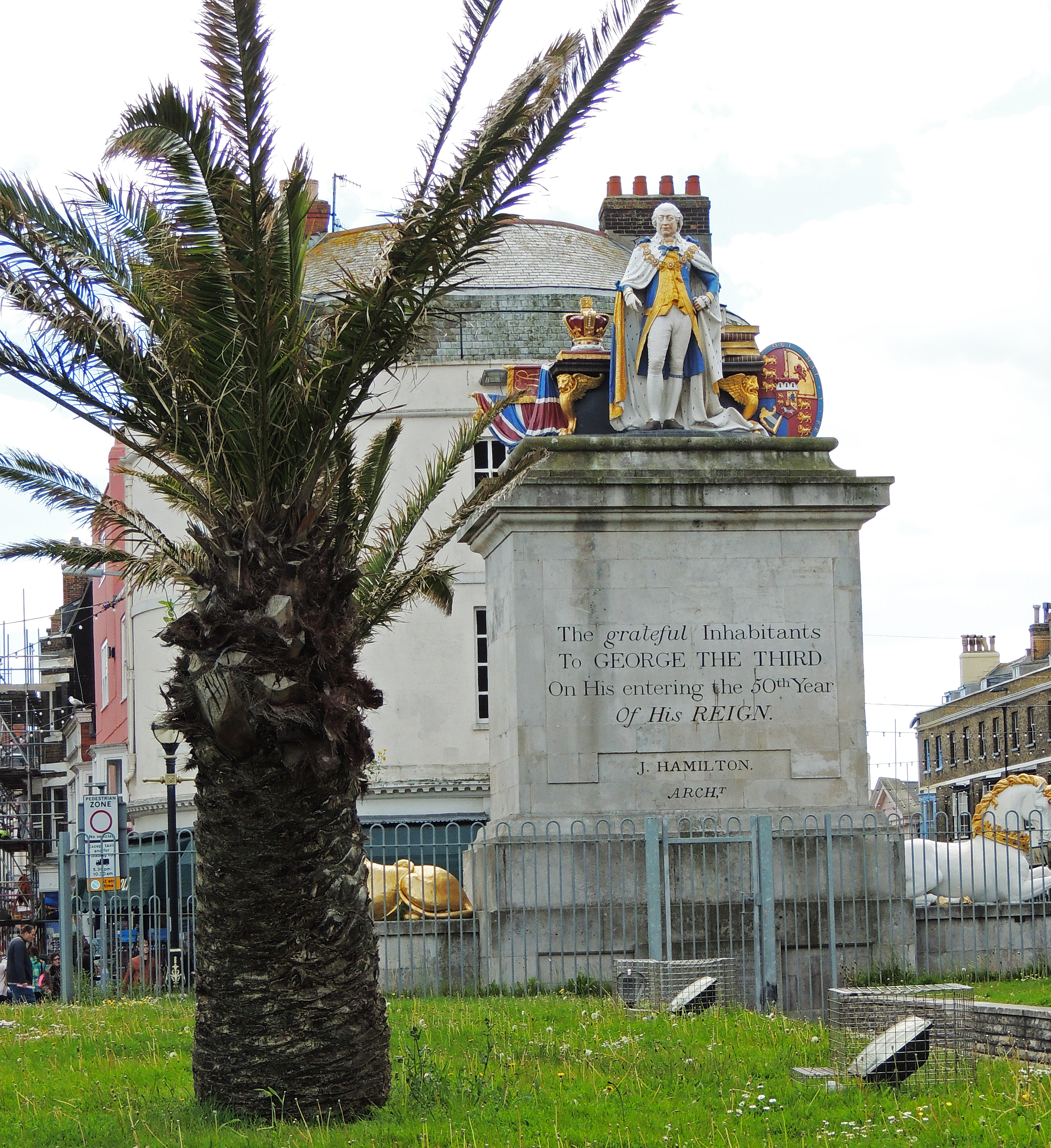 The King’s statue stands on the Esplanade at Weymouth. It is dedicated to King George III, whose took many holidays in the town and due to whose patronage brought much business and prosperity to the town and its inhabitants. It was originally designed in 1805 but was not erected until 1809 due to the King’s illness. It was originally painted bronze and was only coloured in 1948.