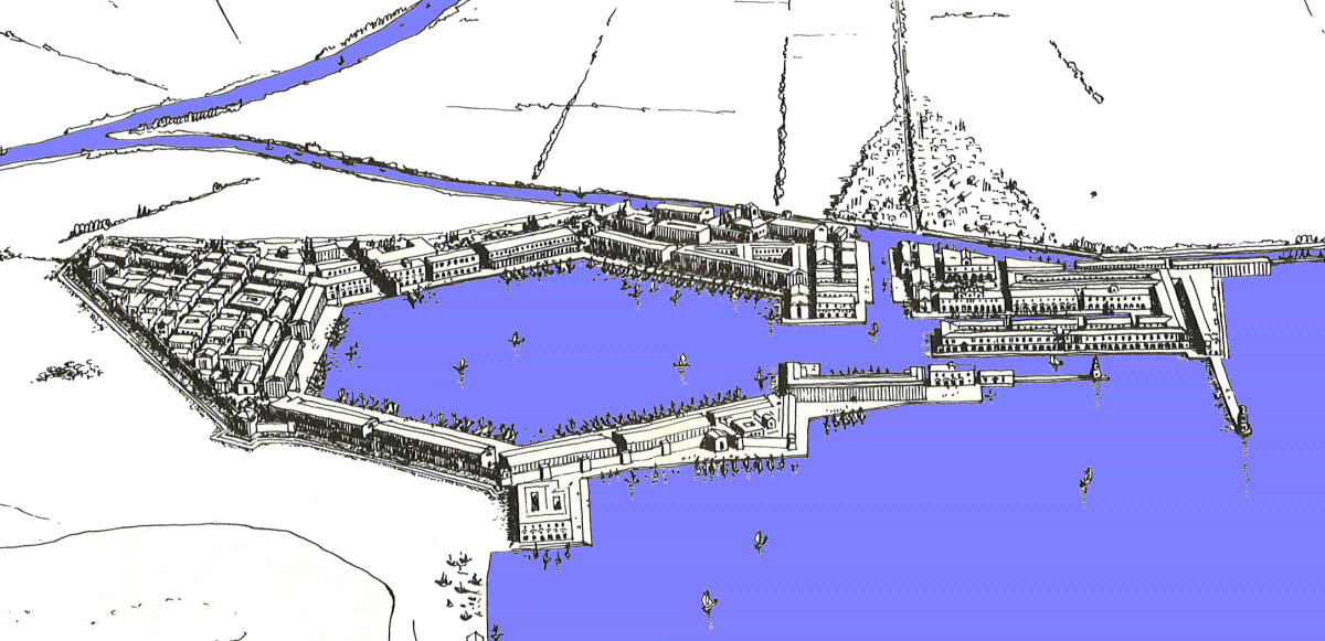 Another interesting building which was constructed at this time is the Navilia. It is situated between the Trajanic and Claudian basins and opened out onto both of them. It consists of three sections, each section at which has three narrow bays and one wide bay. In between each of the sections is a passage. These sections are covered by arches It has been suggested that it was for the building or repairing ships. In the late second century, one of these wide bays was converted into offices and storerooms and artefacts found here include nails , washers and sheathing tacks. These are commonly associated with Roman boats and have only been found on this site in the ruins of the Navilia.