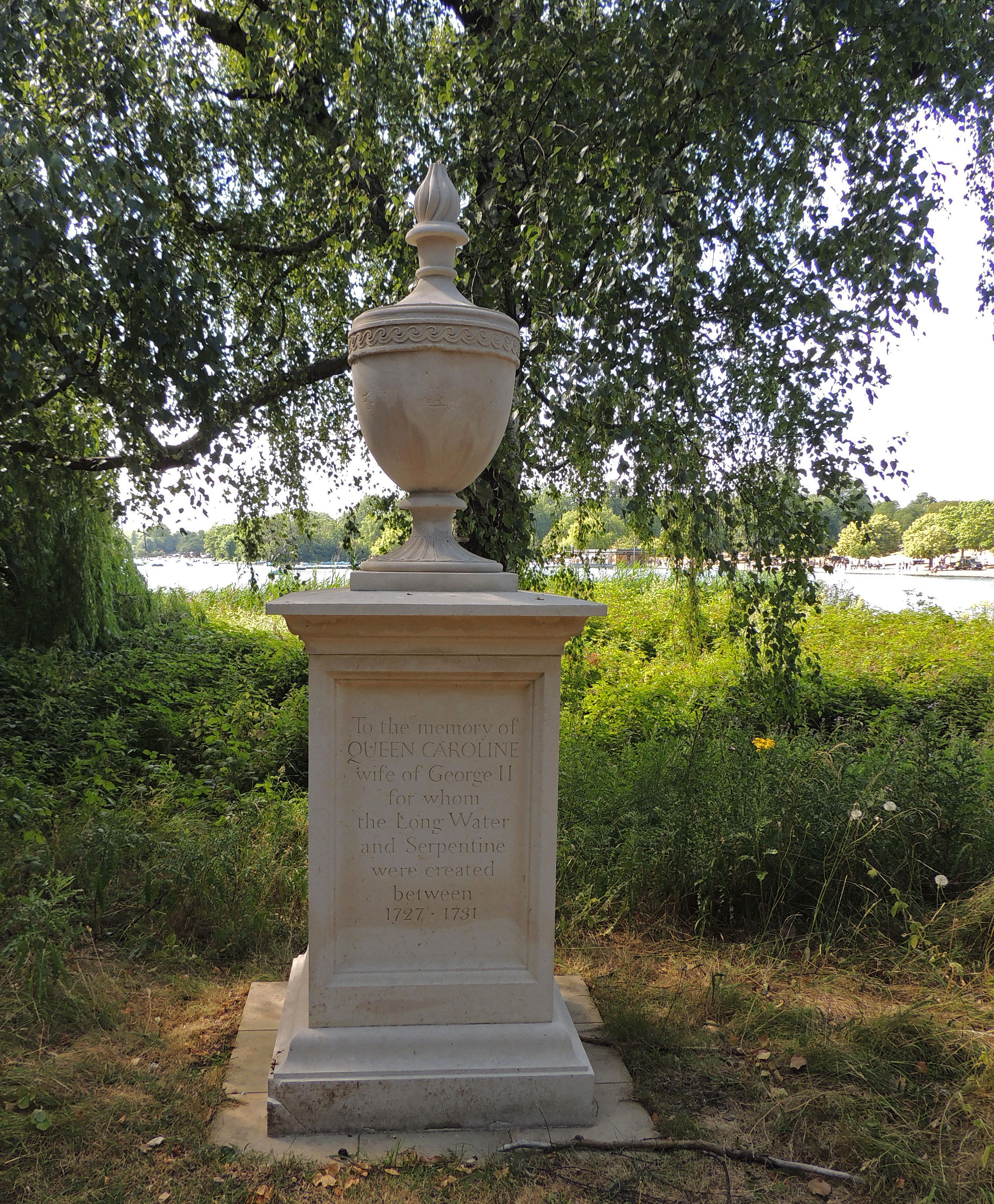 The monument to Queen Caroline and her vision was unveiled by Queen Elizabeth II in 1990 and records her part in the creation of the lake on whose banks it stands.