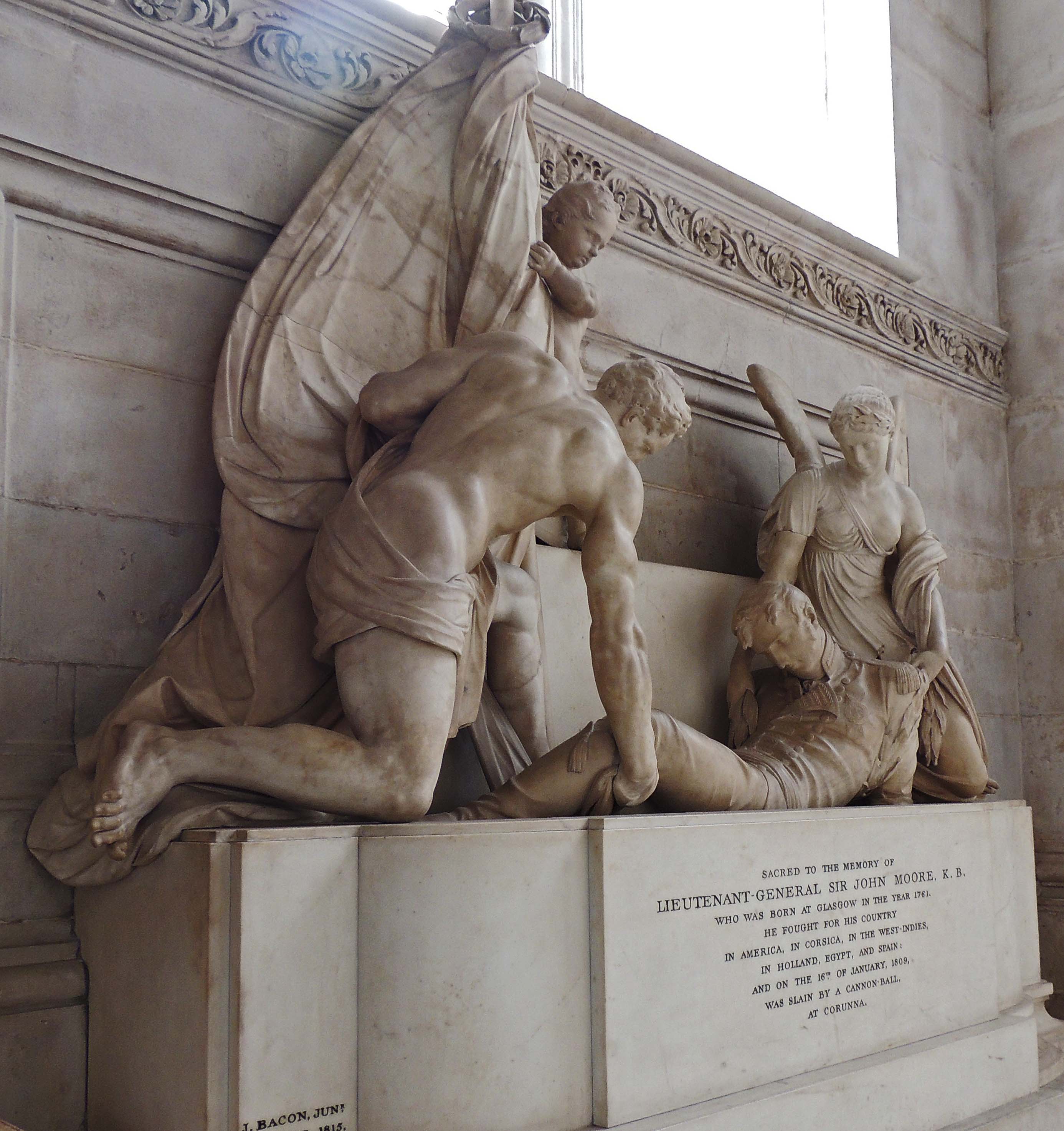 The Death of Sir John Moore by Aquatint by Heath, William (1795-1840) engraved by Sutherland, Thomas (b.1785) [Public domain], via Wikimedia CommonsSir John Moore was buried in the city and when the French eventually took control, Marshall Soult, the French commander, ordered that a monument be built over his grave.