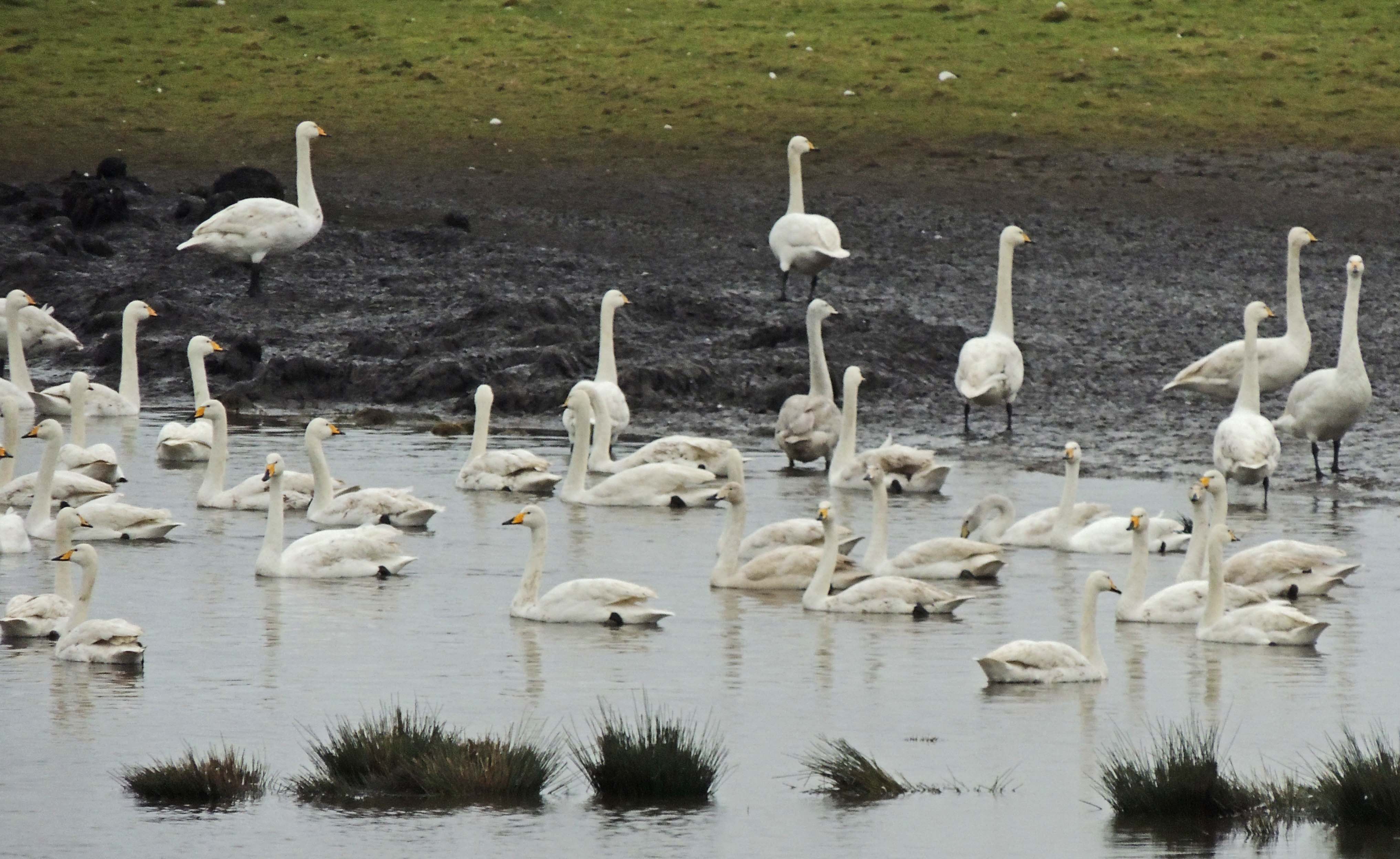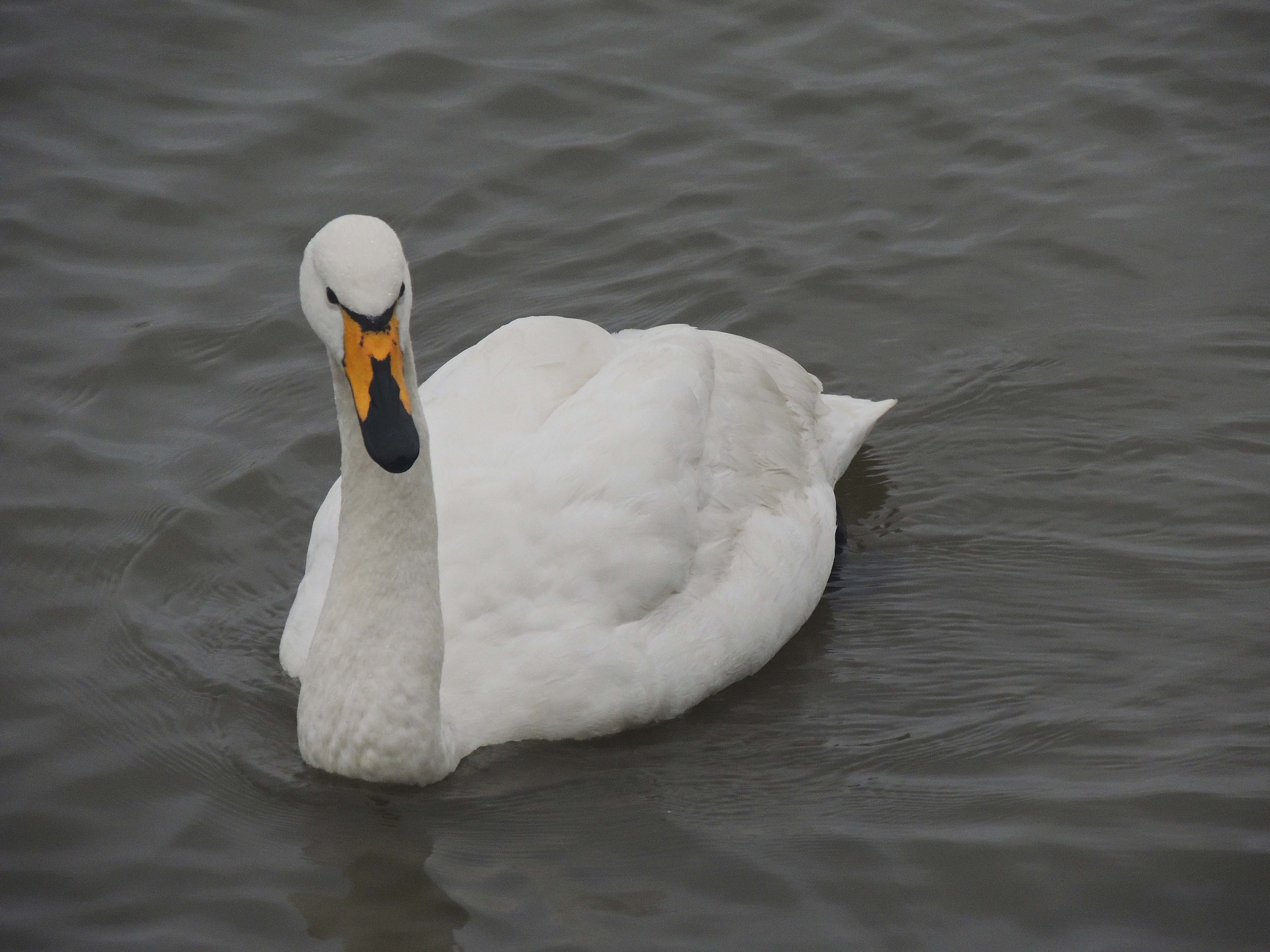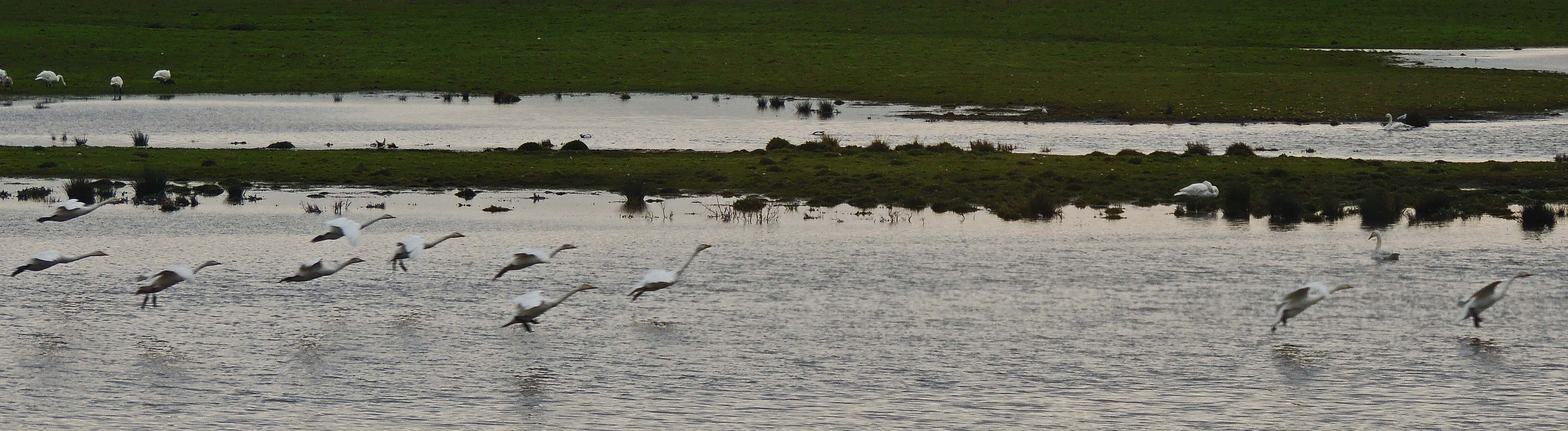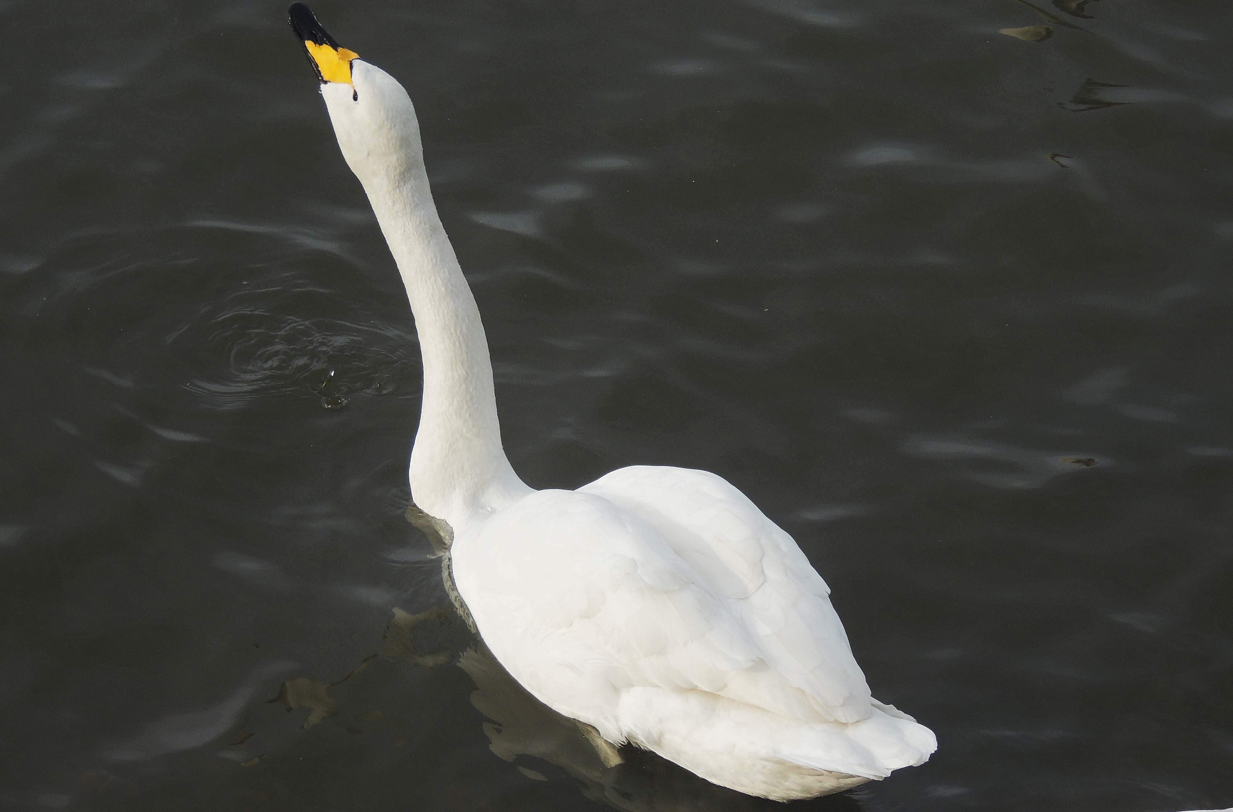 The Whooper Swan is the largest of the 2 migratory swan species which visit the UK in the winter. It is estimated that about 15,000 birds winter in the Uk of which around 7-8.000 winter on the Ouse washes in Norfolk and Cambridgeshire. It can be separated from other swan species by the large yellow triangular marking on the bill.