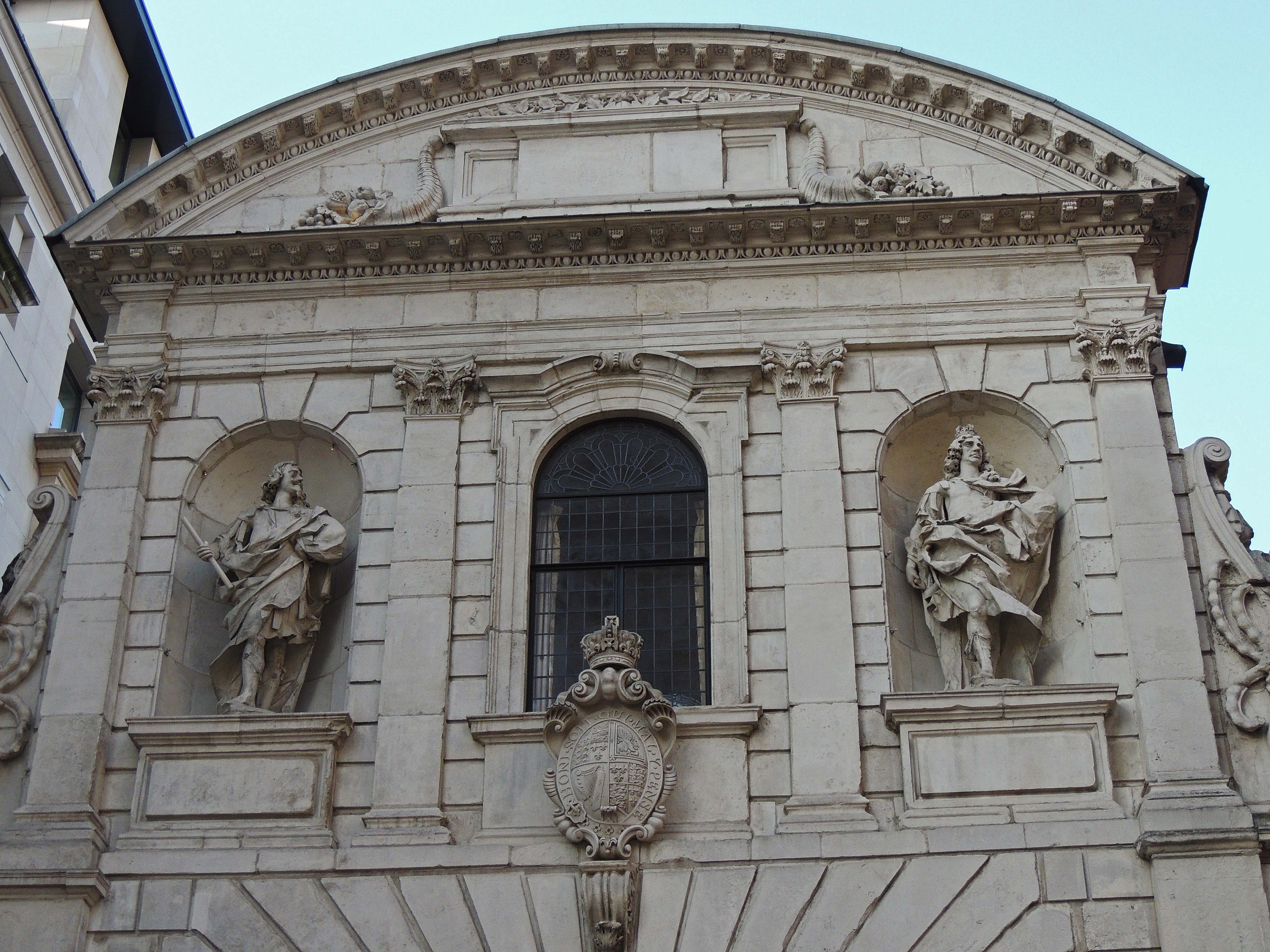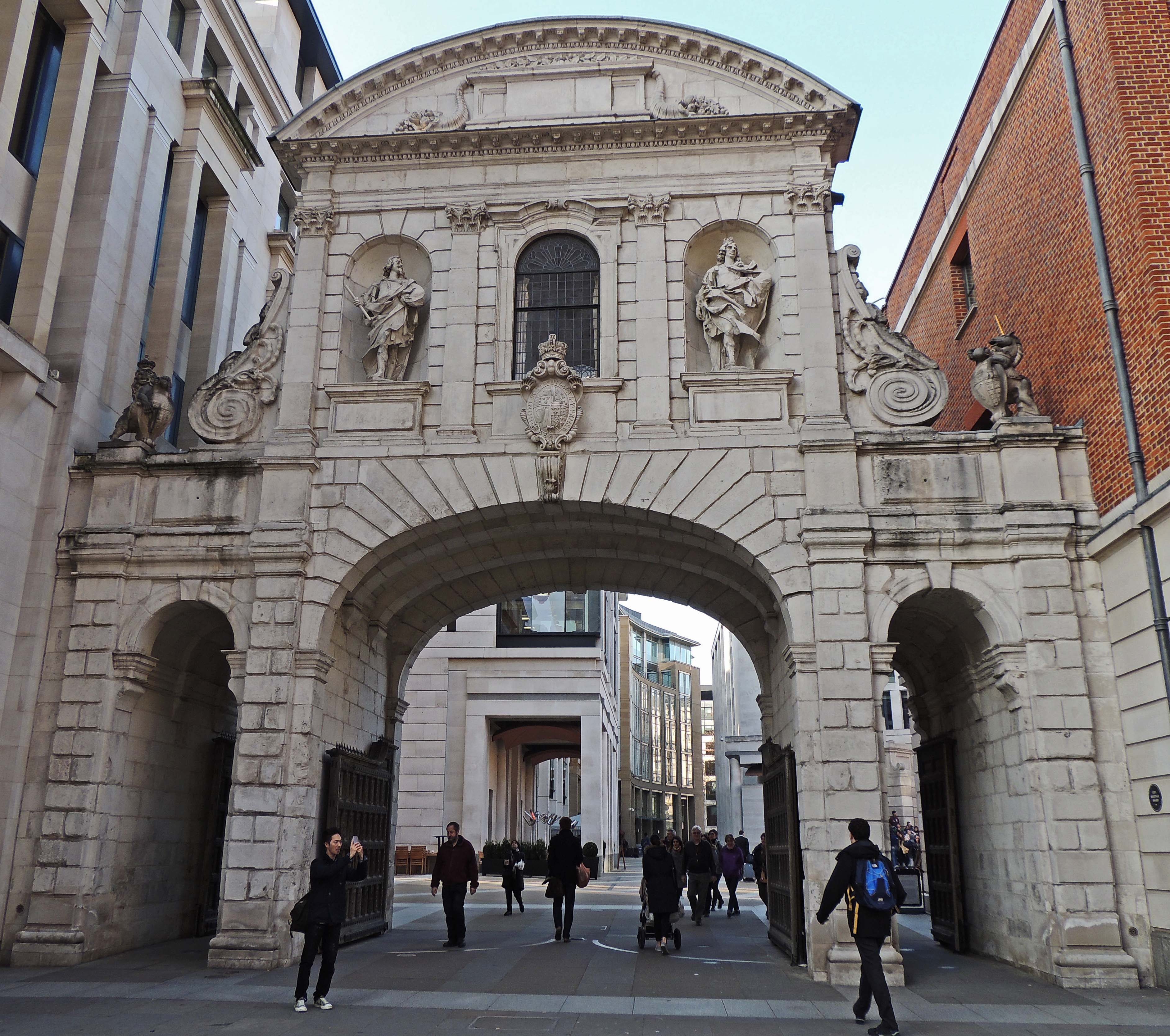 This gateway escaped the Great Fire of London but was redesigned and rebuilt by Christopher Wren as part of his post-fire redevelopment in 1689-72.