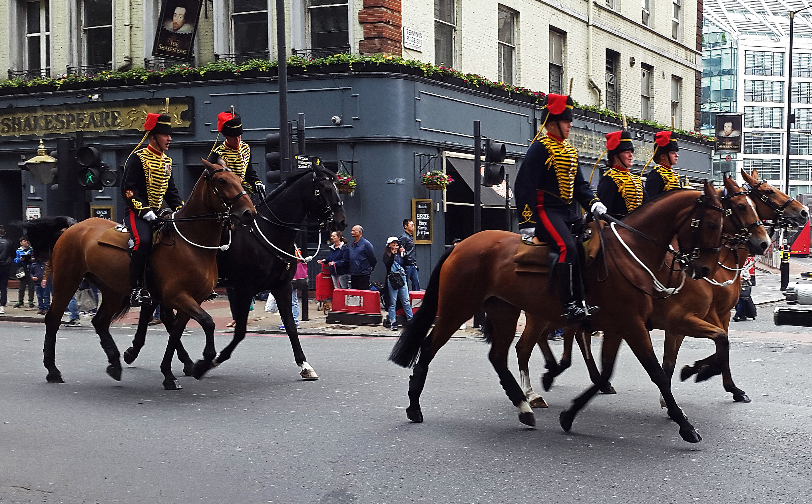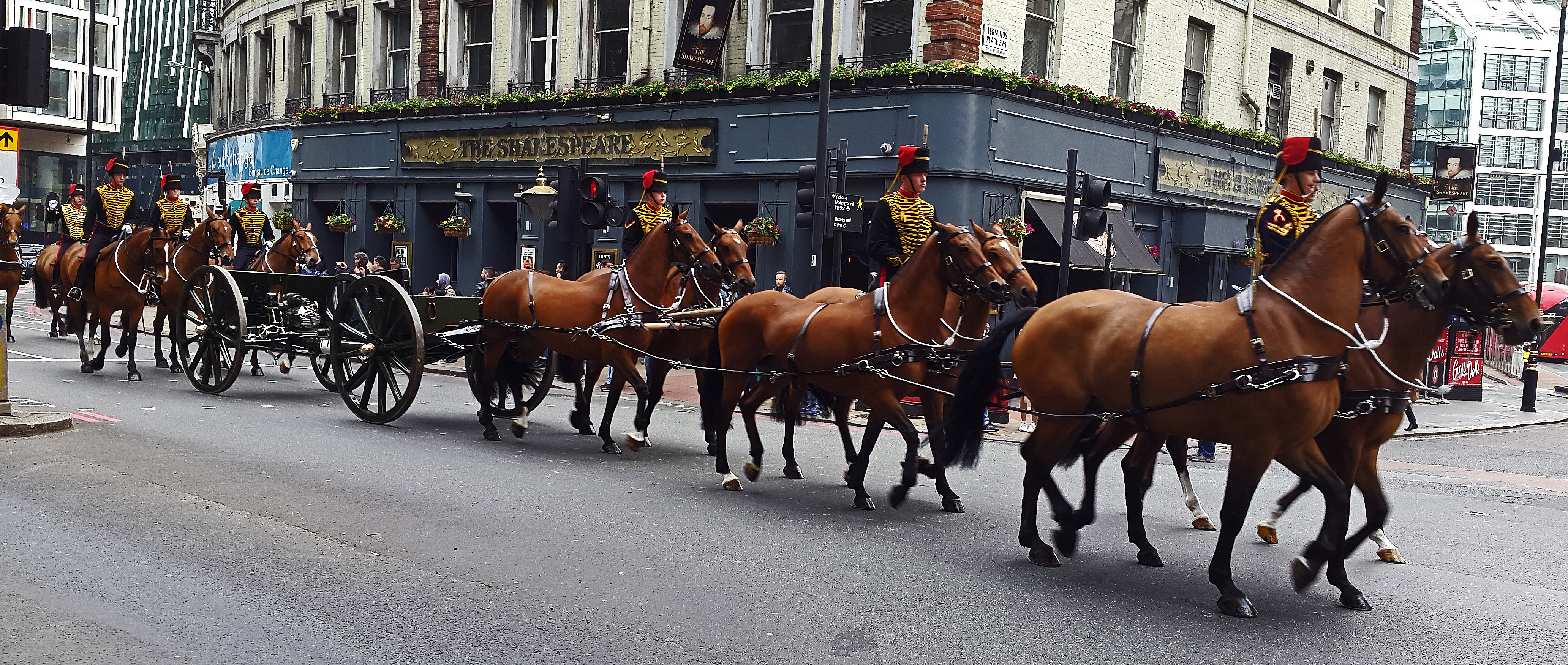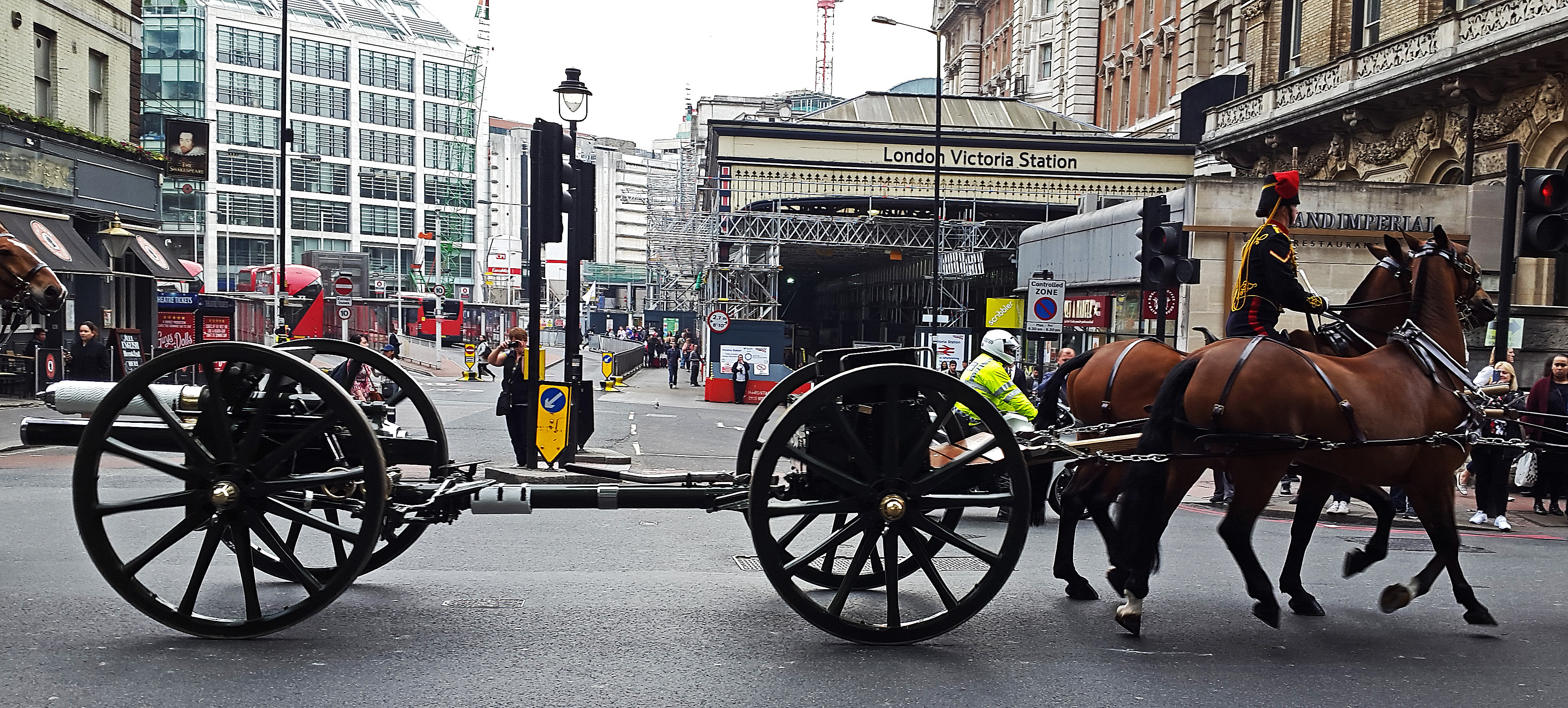 Here the Royal Horse Artillery, whose responsibility it is to fire royal gun salutes, pass Victoria Station (and Sue’s coach stop) on their way back to Barracks.
