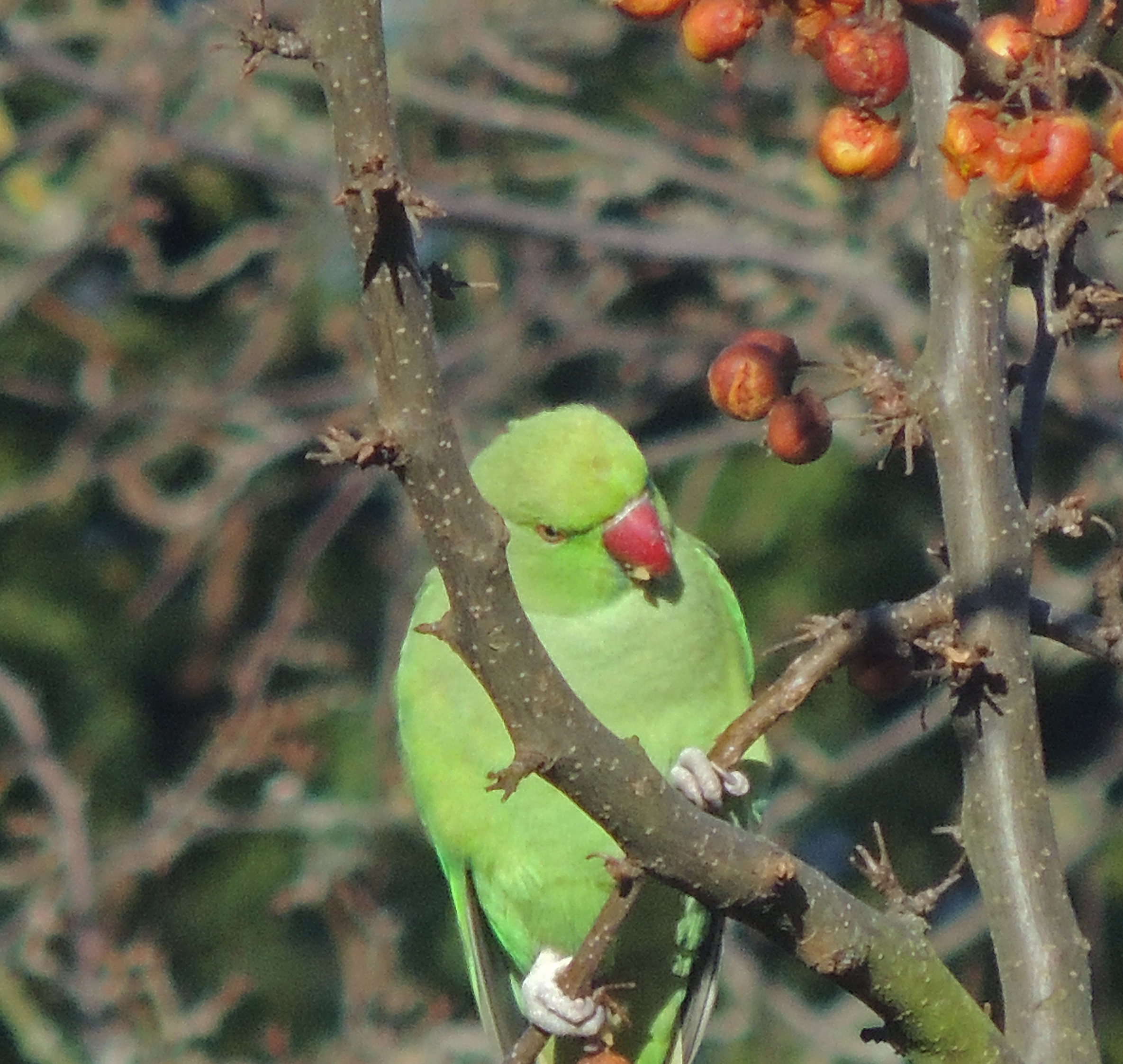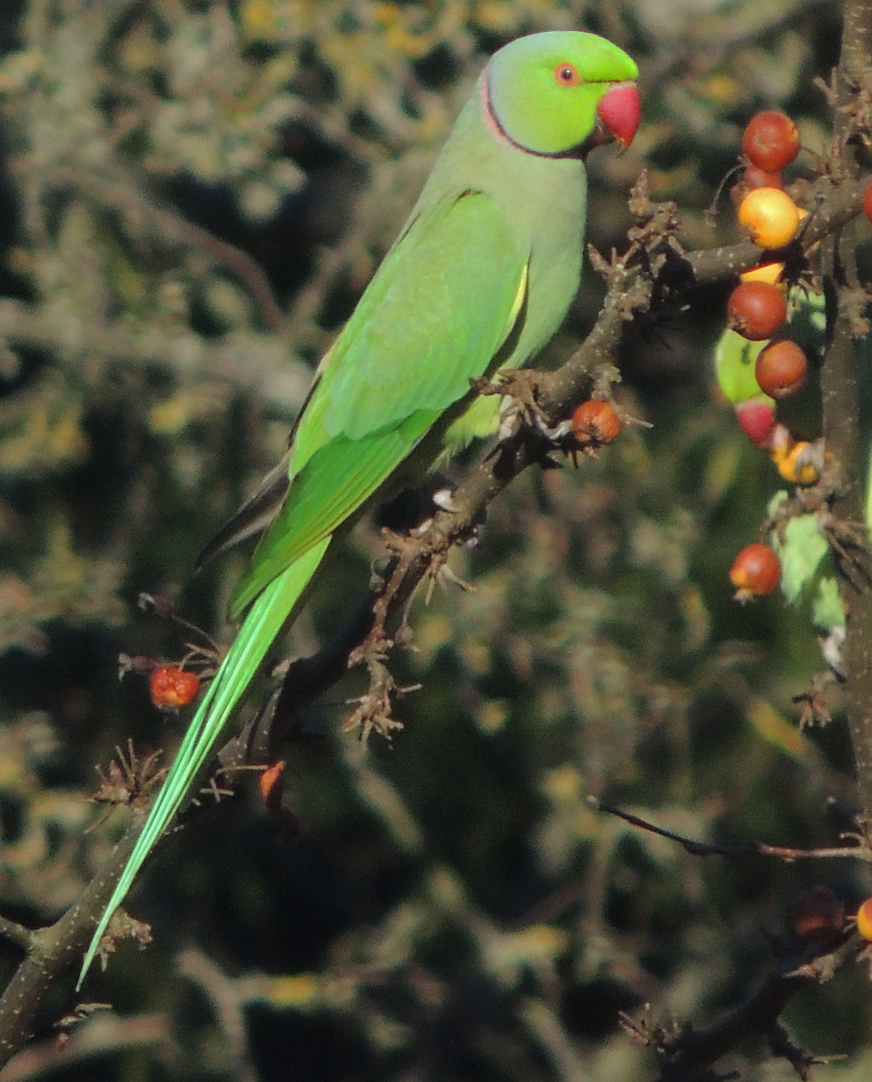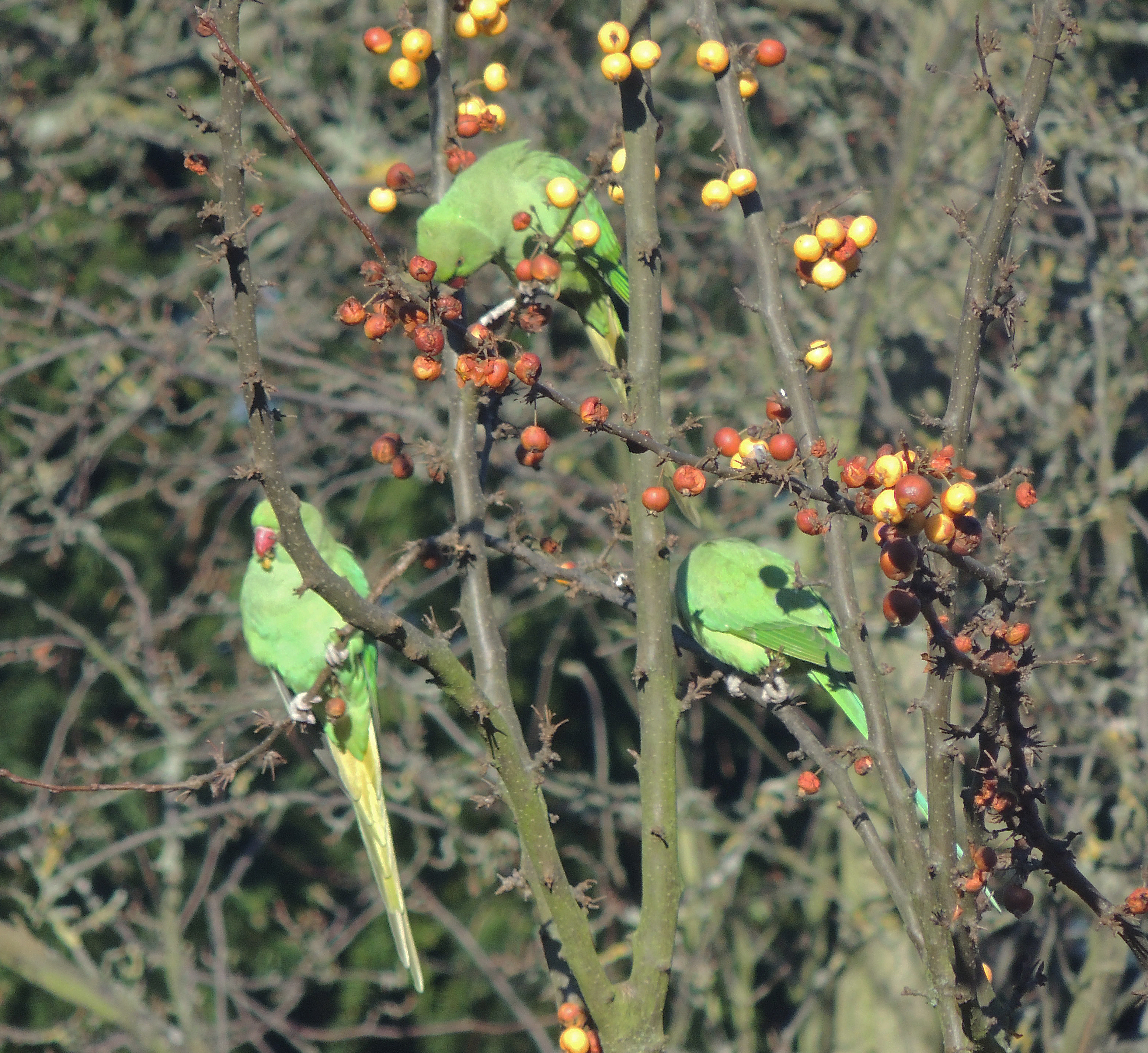 One of the signs that we are passing from autumn into winter is the arrival in the garden of flocks of Ring-necked parakeets to feed on the berry trees. This party of 8 dropped in for a snack yesterday.