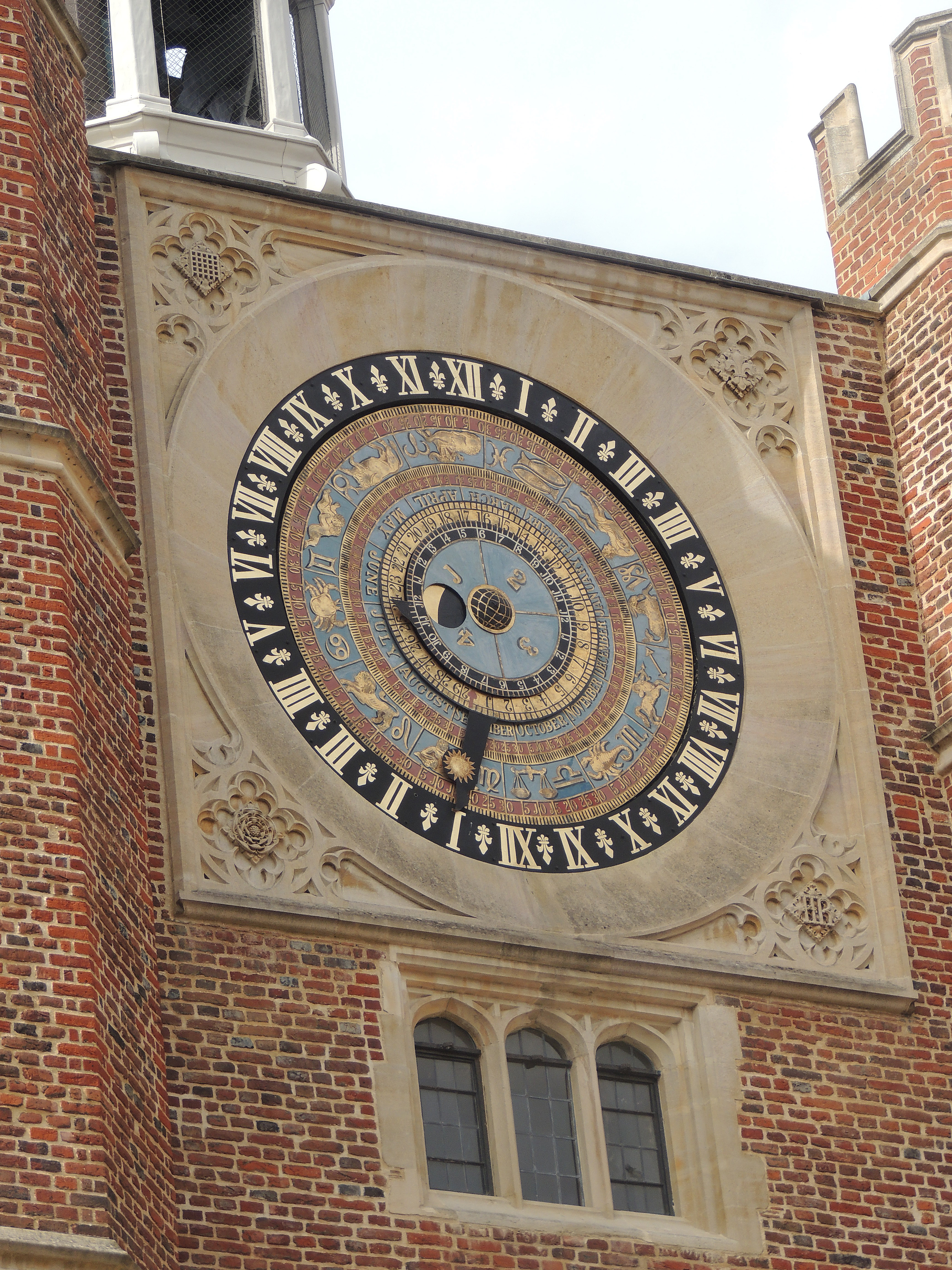 The clock, designed by Nicholas Cratzer and built by Nicholas Oursain, was originally installed on the gatehouse to the inner court in 1540. It is 15 foot in diameter and has 3 separate dials all rotating at different speeds. It was restored in 1711 and again in 2007 and is still in working order.