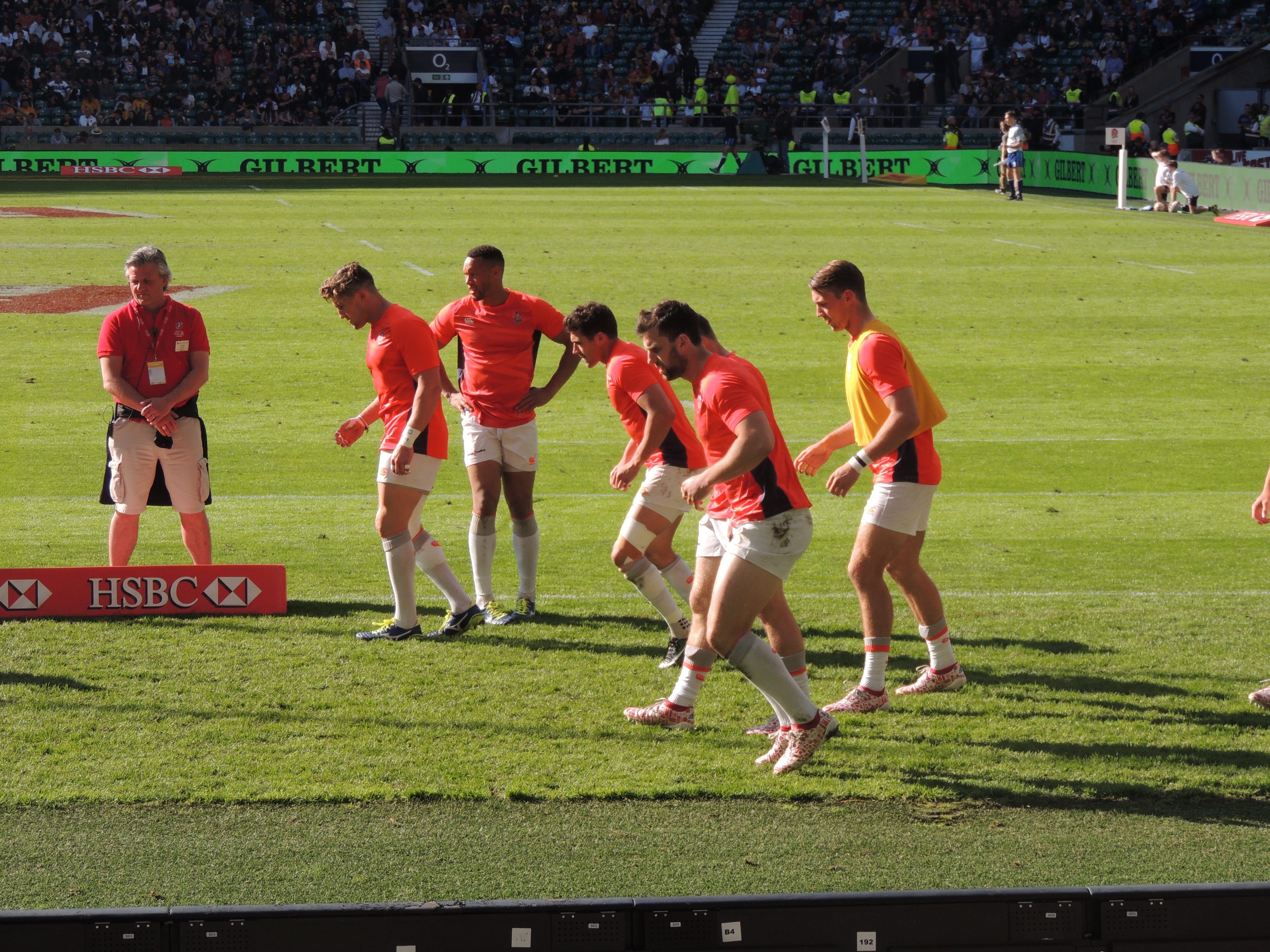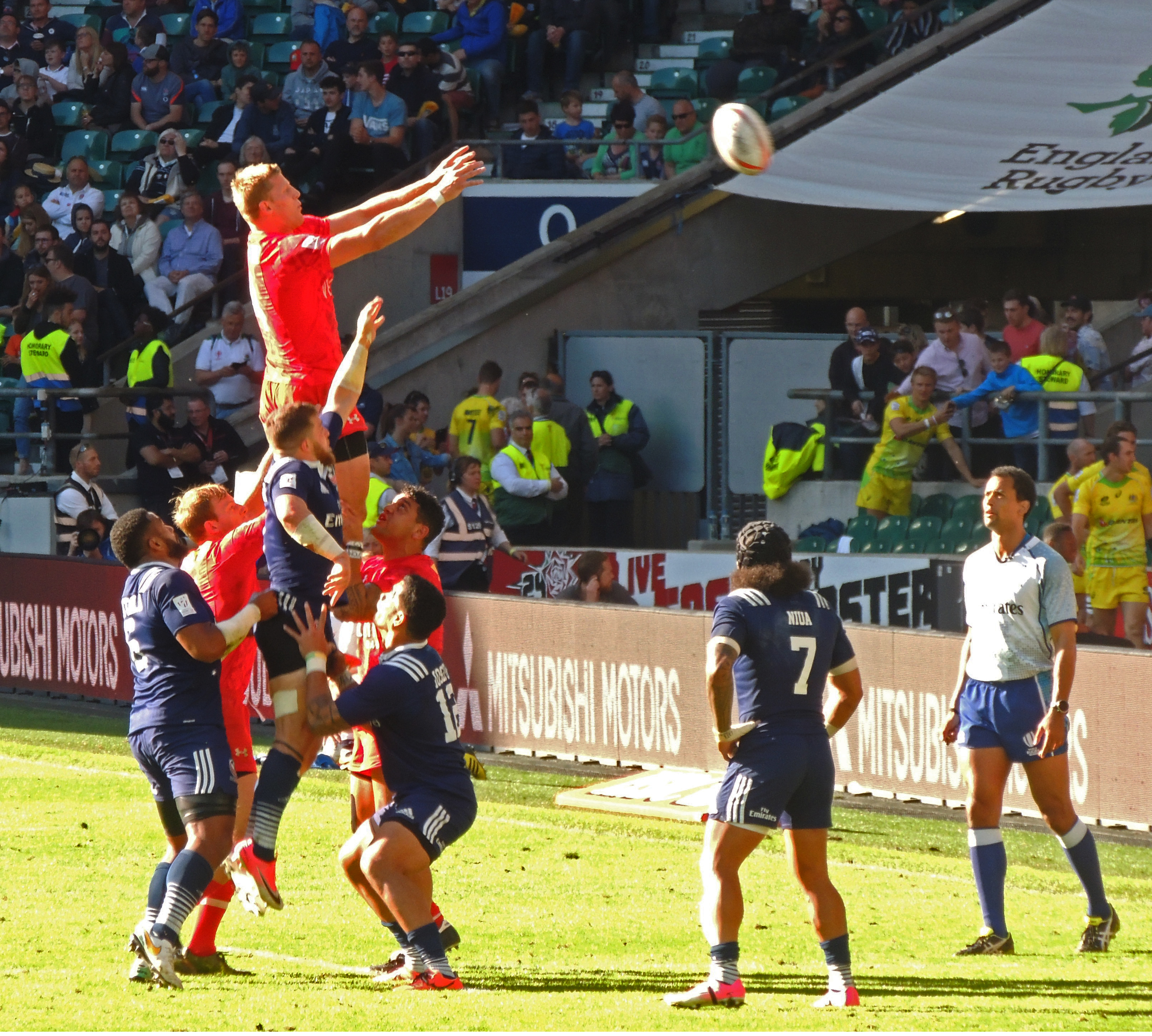 South Africa secure the line-out ball against AustraliaAustralia kick for goal against South AfricaCanada head for the try line against the USA.Canada out jump the USA to gain possession of the ball from a line-outEngland warm up for the finalEngland line up before the final for the national anthemsScotland head for the try line against EnglandScotland keep the ball moving against England