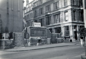The stone was relocated in a grilled niche in the wall of this building, the ground floor of which was used as a stationer and newsagents. This was not a very satisfying relocation as being at ground level it rather looked like a ventilation grill. I wonder how many people walked past it each day and didn’t even know it was there?