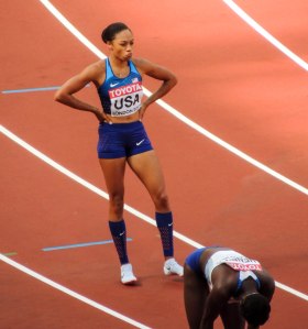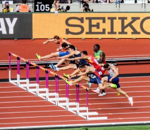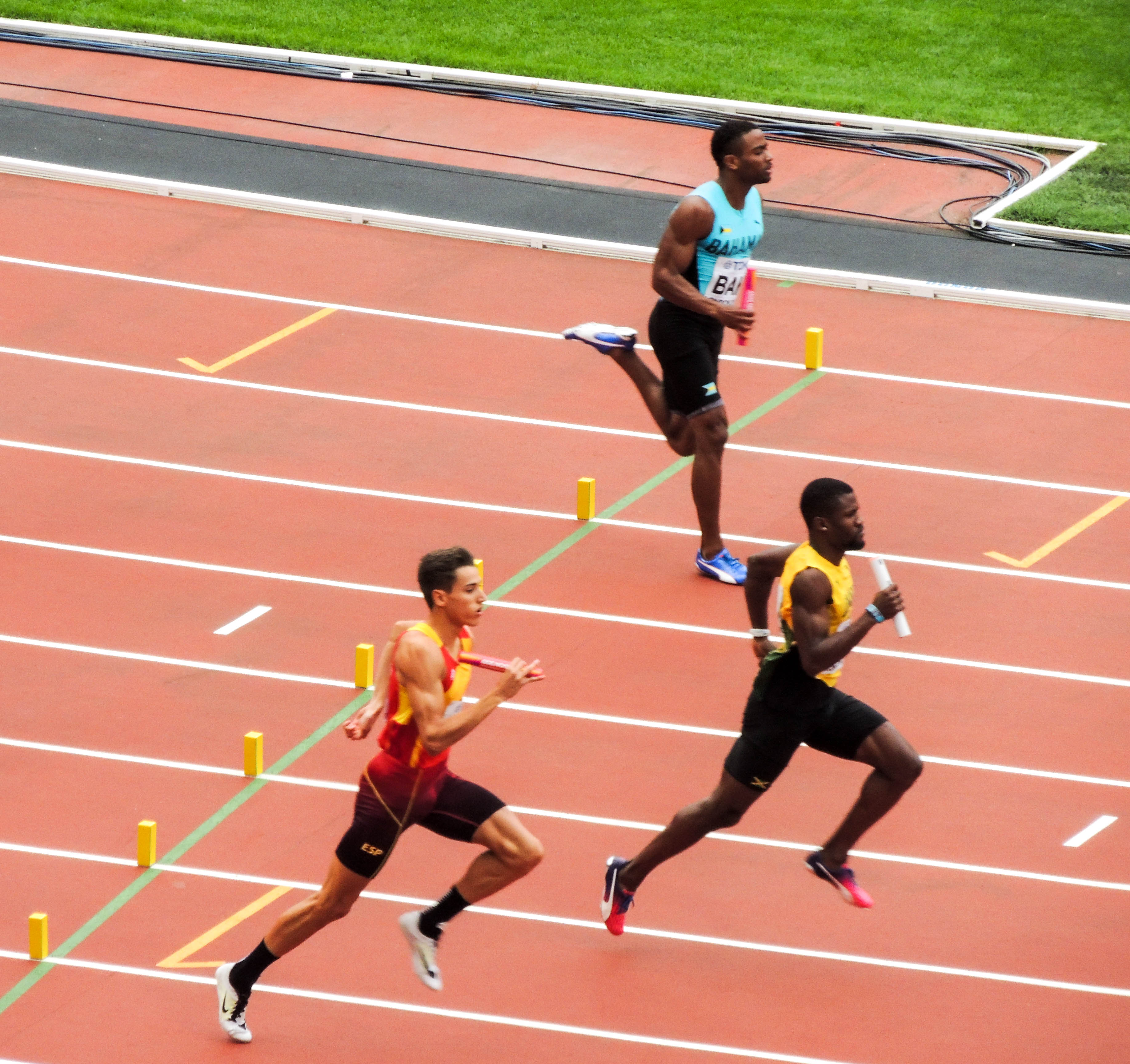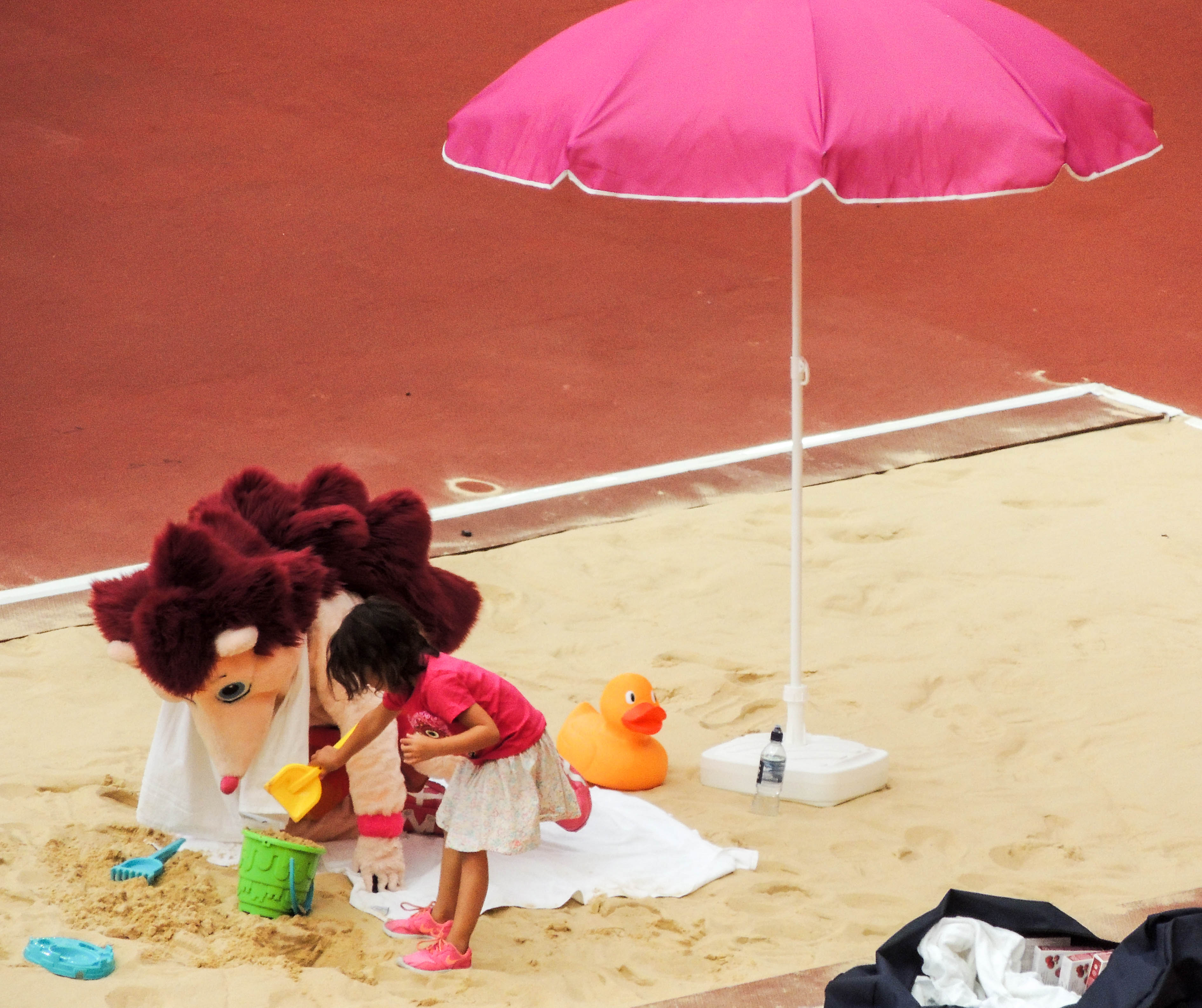 A full crowd as there has been for each SessionMen’s 110m Hurdles race in the DecathlonMen’s 110m Hurdles race in the DecathlonAlyson Felix (USA) – one of the worlds best sprinters over the past decade prepares for the sprint relay heatsChangeover for USA and GB teams in women’s 4x100m relay heat – both qualified for the final.Good to see Adam Gemili back in GB team after injuryMen’s 4x100m relay heatUsain Bolt preparing for a 4x100m relay heatJamacia leads out in men’s 4x400m relay heat.Kevin Meyer of France in the Discus section of the men’s decathlon.I imagine this is not what the organisers had in mind for the Long Jump pit. Hero the Hedgehog and friend enjoy the sand.