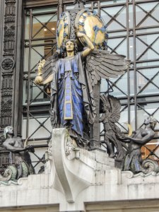 This statue stands above the main entrance to the well-known London store Selfridges situated in Oxford Street. It depicts the Queen of Time and was created by Gilbert Bayes. It was unveiled in 1931.