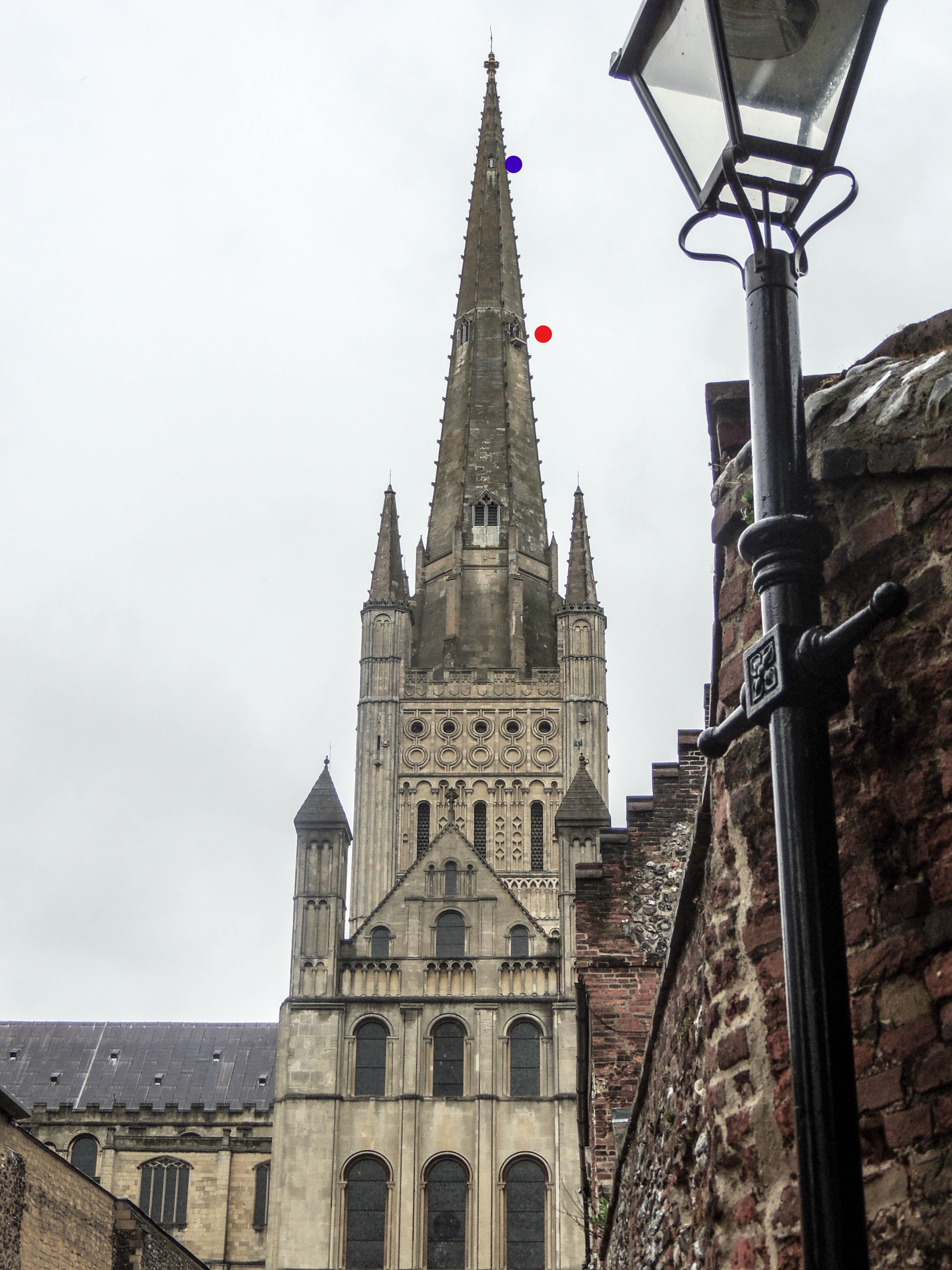 On our arrival in Norwich, we made our way to the Cathedral Close to look and see if we could see the nesting Peregrines. The nest is on a platform located on a window-ledge on the spire (marked with a red dot on photo).
