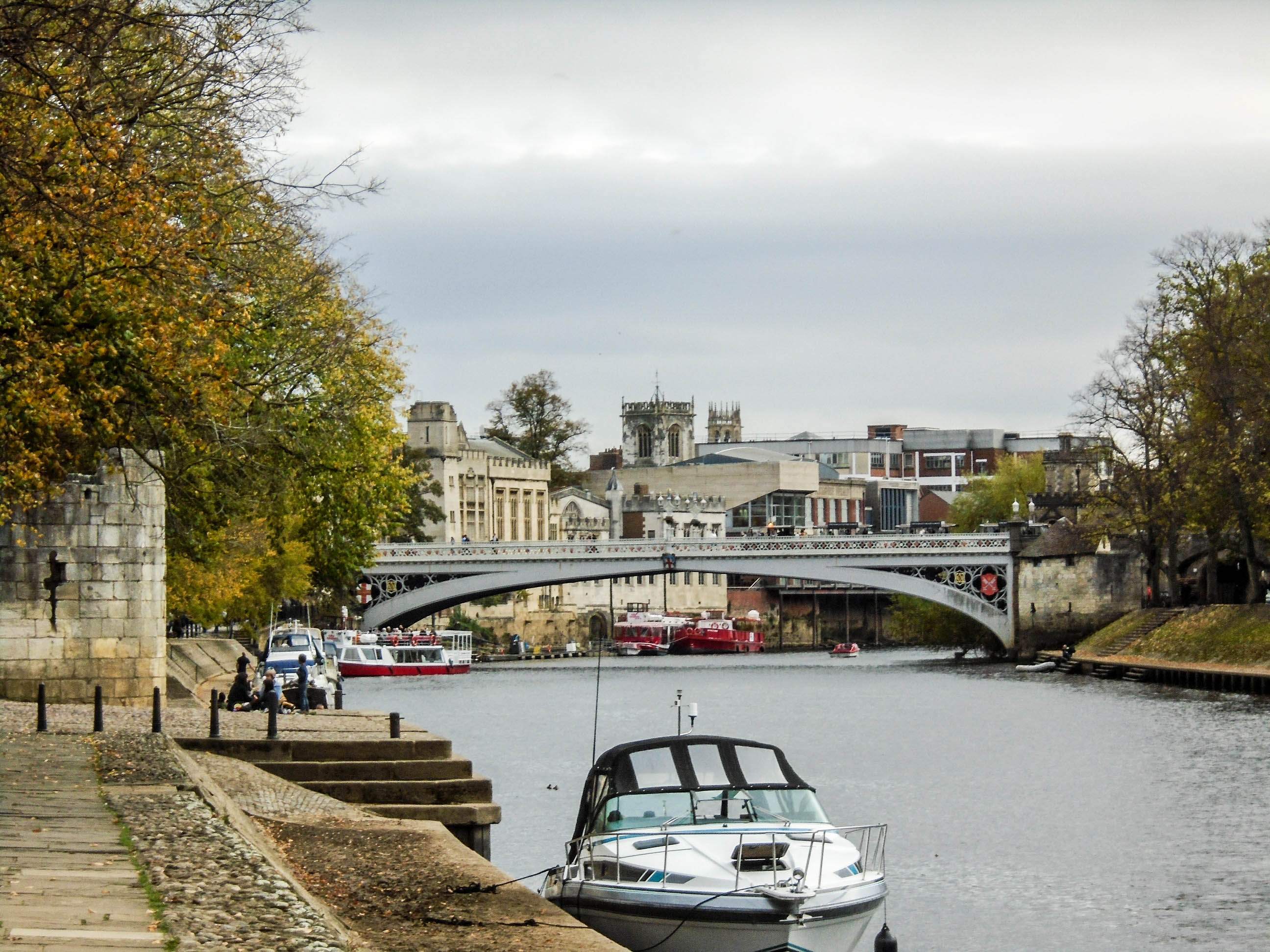 River Ouse looking towards Lendel Bridge (top left), Medieval Houses (top right), York Minster (lower left), and Bootham Bar, one of the old city gates (lower right)