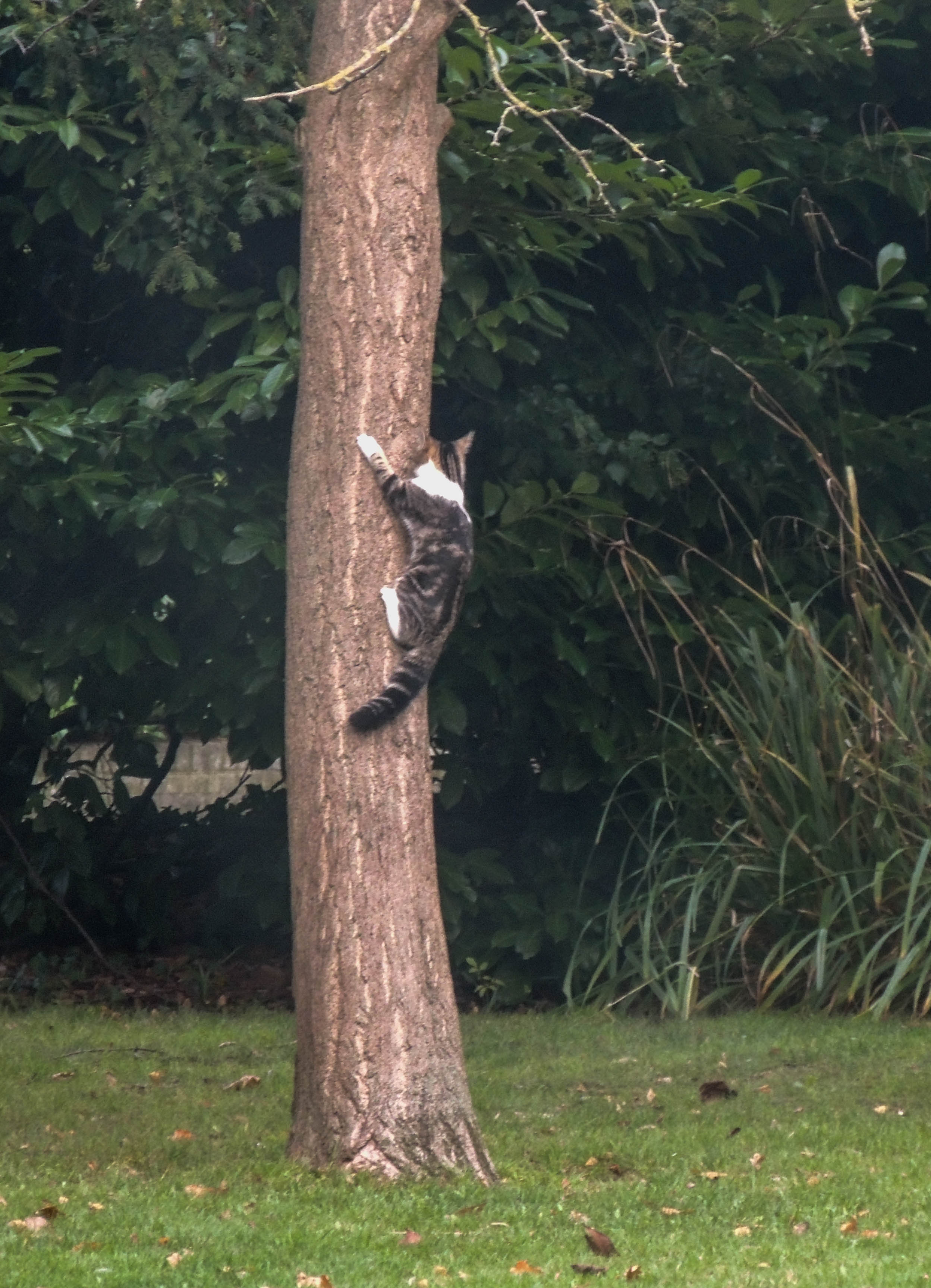 The cat spent a few days patrollling round the bottom of the tree waiting for the squirrels to come down, which of course they don’t. So eventually it took the plunge and tried to climb the tree. It got so far and stopped. It looked around as if to say ‘oops now what do I do’. Eventually it realised that if it let go it would land back on solid ground. But it wasnt finished, it took a longer run up and ended up in exactly the same place. Again after considering the options it dropped back to the ground and slunk off. Squirrels 1 Cat 0.