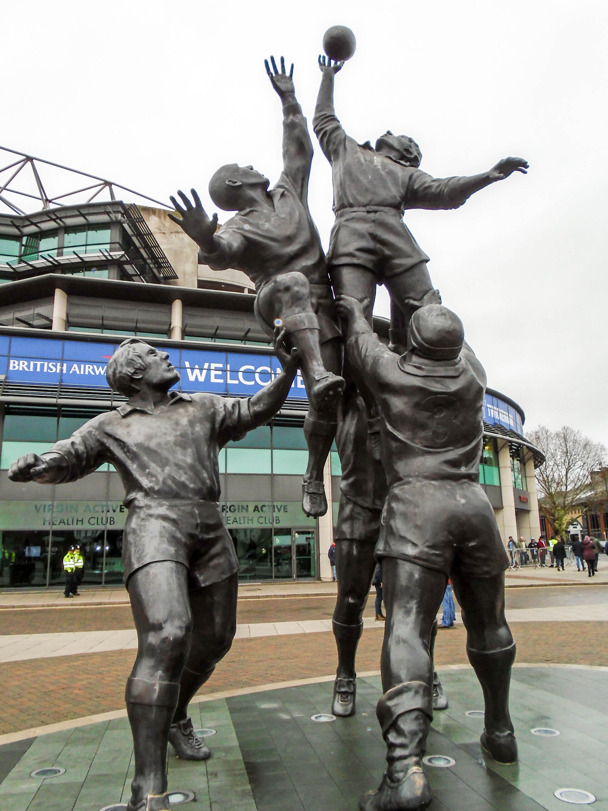 The 27 ft tall sculpture depicts a line-out and around its base are the core values of the game: Teamwork, Respect, Enjoyment, Discipline and Sportsmanship. It was sculpted by Gerald Laing, who also created the sculptures which sit upon the stadium’s west gate.