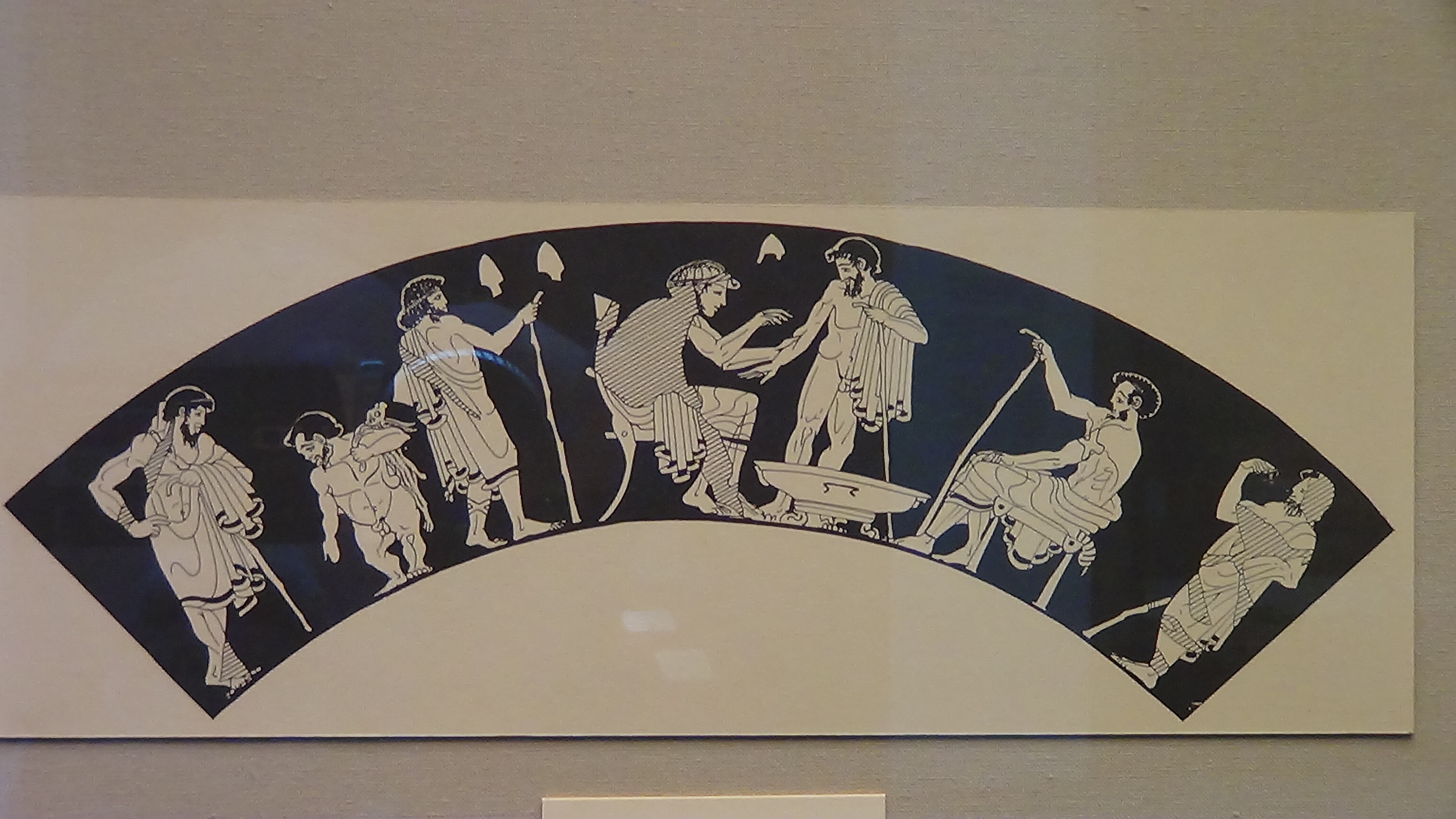 This image of a doctor’s surgery is taken from a Greek vase made in Athens about 480 to 470 BCE. On the left the dwarf can be seen ushering the patients into the surgery, where people are waiting to be seen by a physician. In the centre a seated Physician is seen treating a patient’s arm. Another patient who was already been treated and has his arm bandaged looks on. The hare or rabbit held by the dwarf may be the patients payment to the physician for the treatment he is receiving.