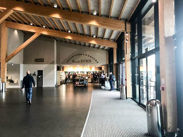 The new service station opened in 2014 as a partnership between the farm and a local community trust. It has a farm shop selling local produce, a butchery selling local meat and a cafe serving homemade food. Part of the profit is fed back into local community projects. It is also light and airy and has a very different atmosphere to the usual service station.